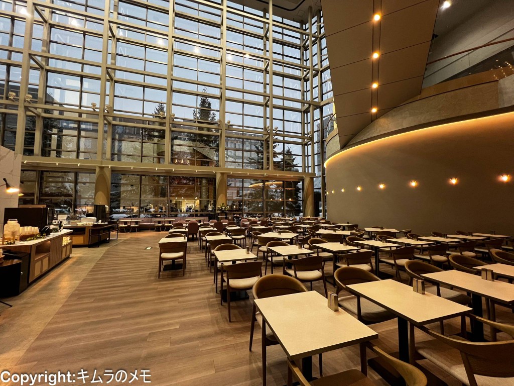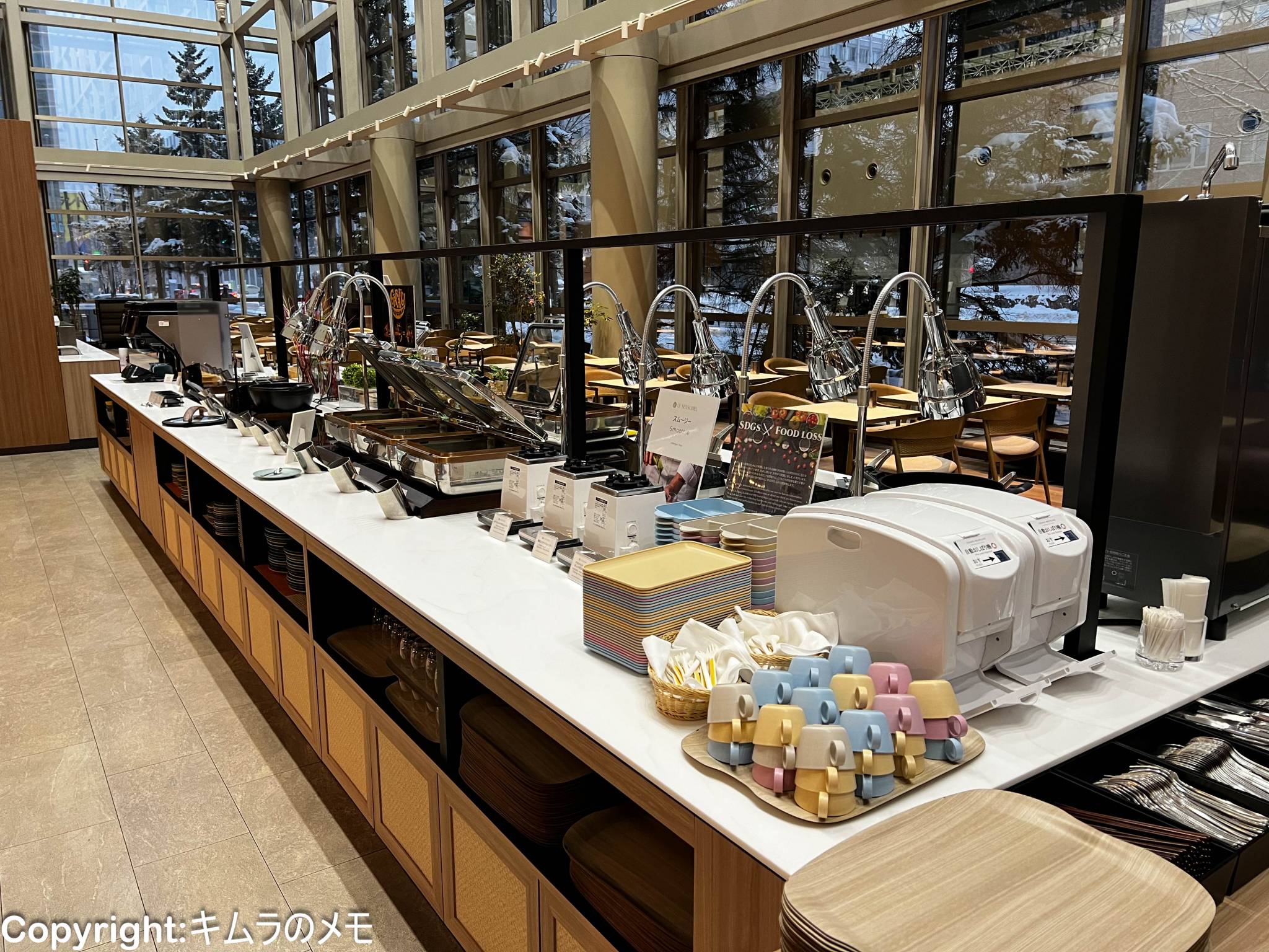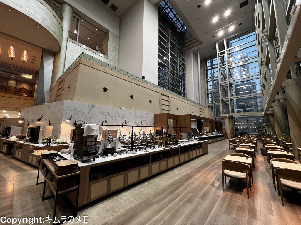 ラウンジ奥の方には朝食ビュッフェ時に料理が提供されるエリアもある。