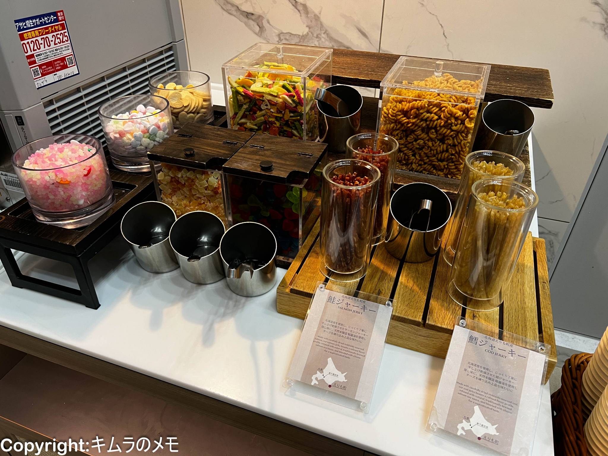 ナッツやドライフルーツなどの他に鮭ジャーキーや鱈ジャーキーなど用意されている。