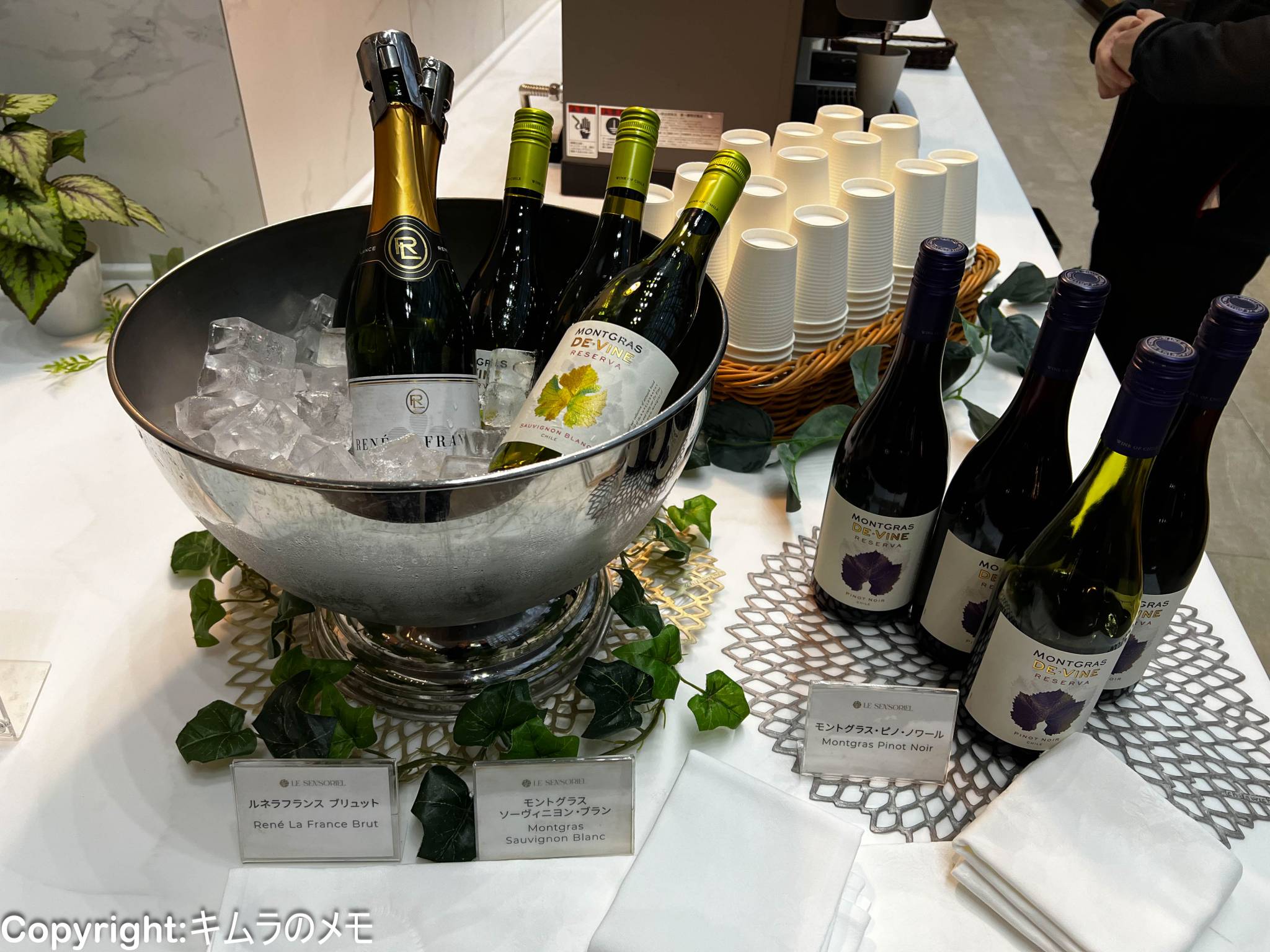 泡はフランスの「ルネ ラ フランス ブリュット」(市価1200円程度)、白はチリのモントグラスがつくる「モントグラス デ ヴァイン ソーヴィニヨンブラン」(市価1400円程度)と同じく「モントグラス デ ヴァイン ピノノワール」(市価約1400円)のものが置かれている。