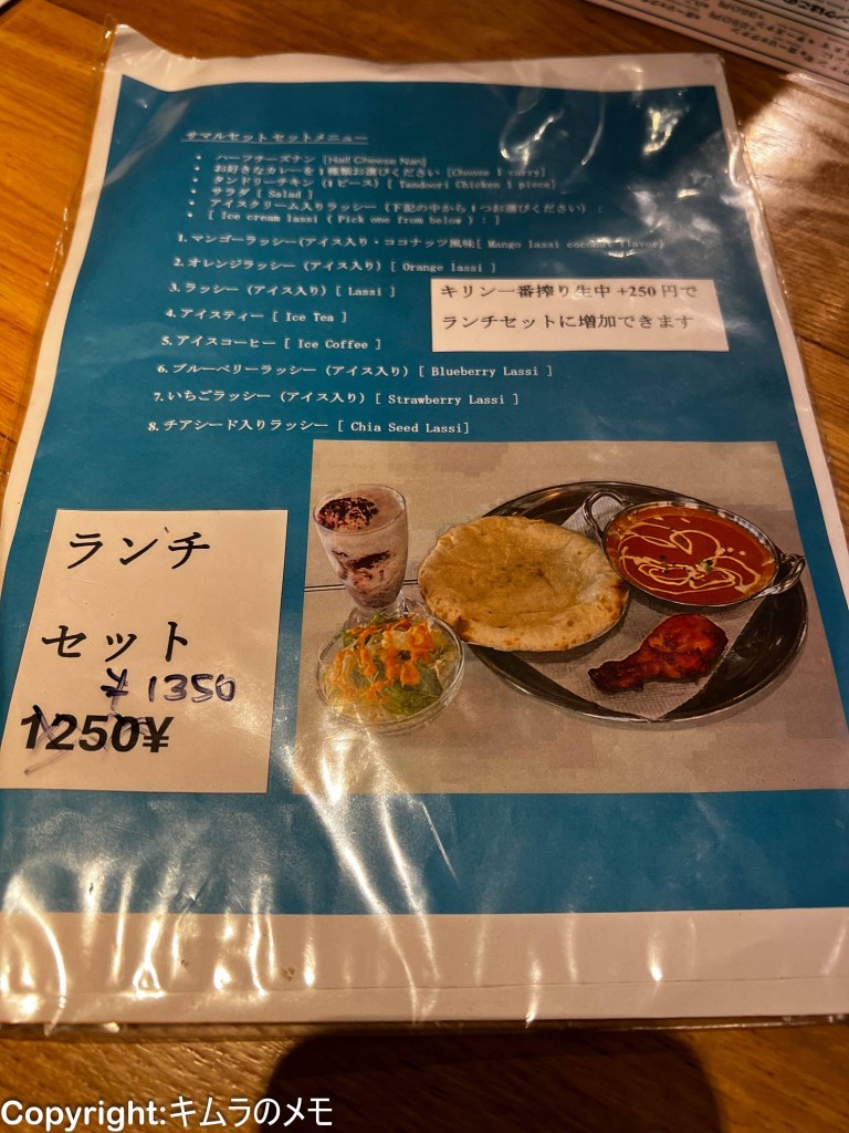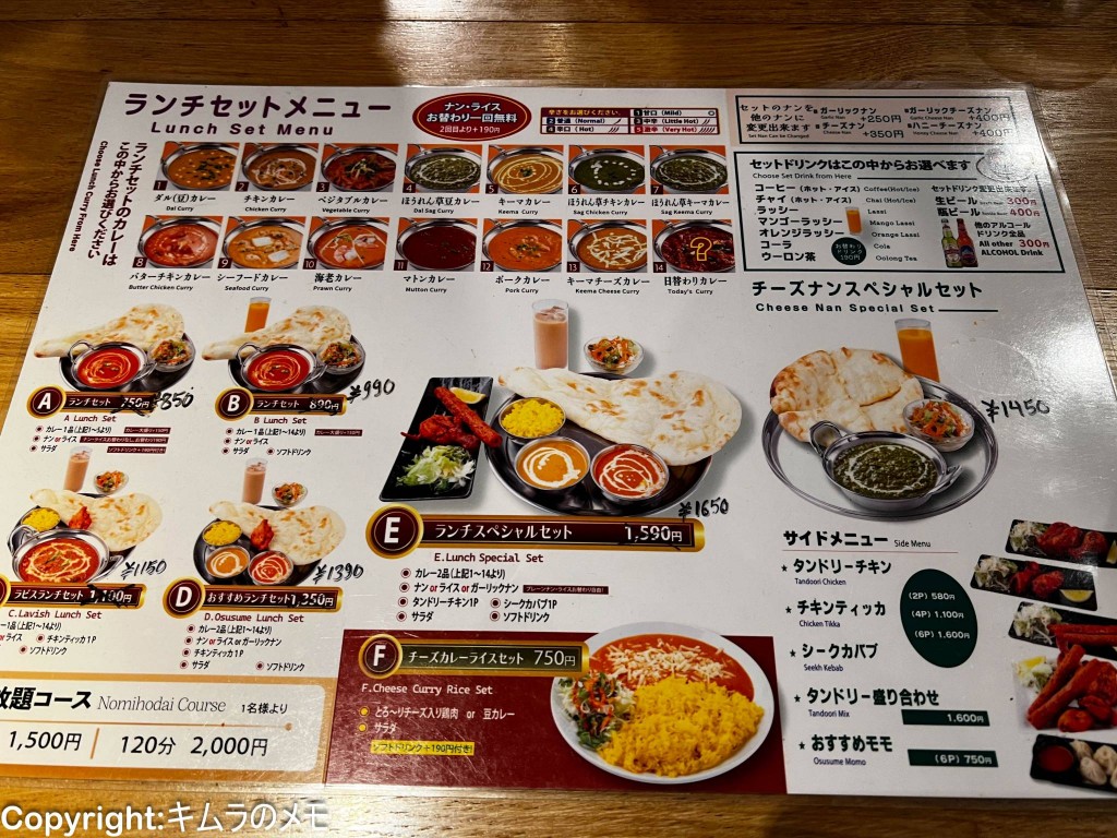 メニューを見ると、定番のカレーとナンのセットがあり、選べるカレーの数によって値段が変わるスタイルもよくあるパターン。