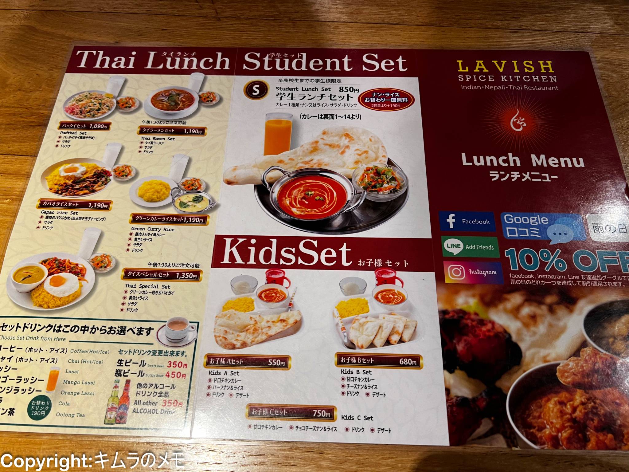裏面にはタイ料理のメニューやキッズメニューが記載されている。