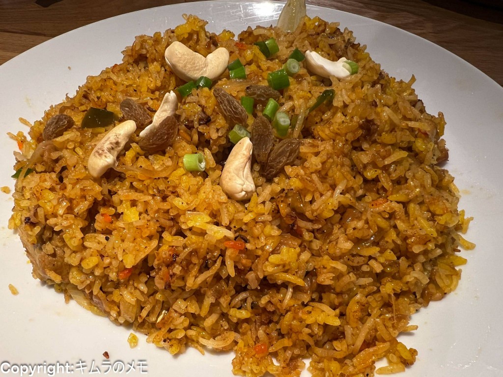 全体的に油感が強めで、いわゆるビリヤニと言われているものと比較すると少々違う気もするが、「インド風スパイスチャーハン」というような感じで頂く分にはありかも知れない。