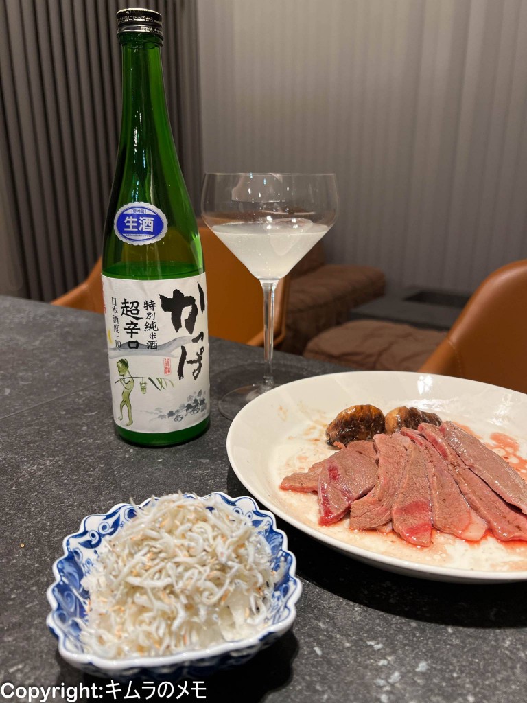 この日は鹿児島県産の牛肩ロースを焼いたものと愛知県産のしらすと神奈川県産の大根を鬼おろしでおろした「しらす大根」というコテコテの飲兵衛つまみ和食と合わせてみた。