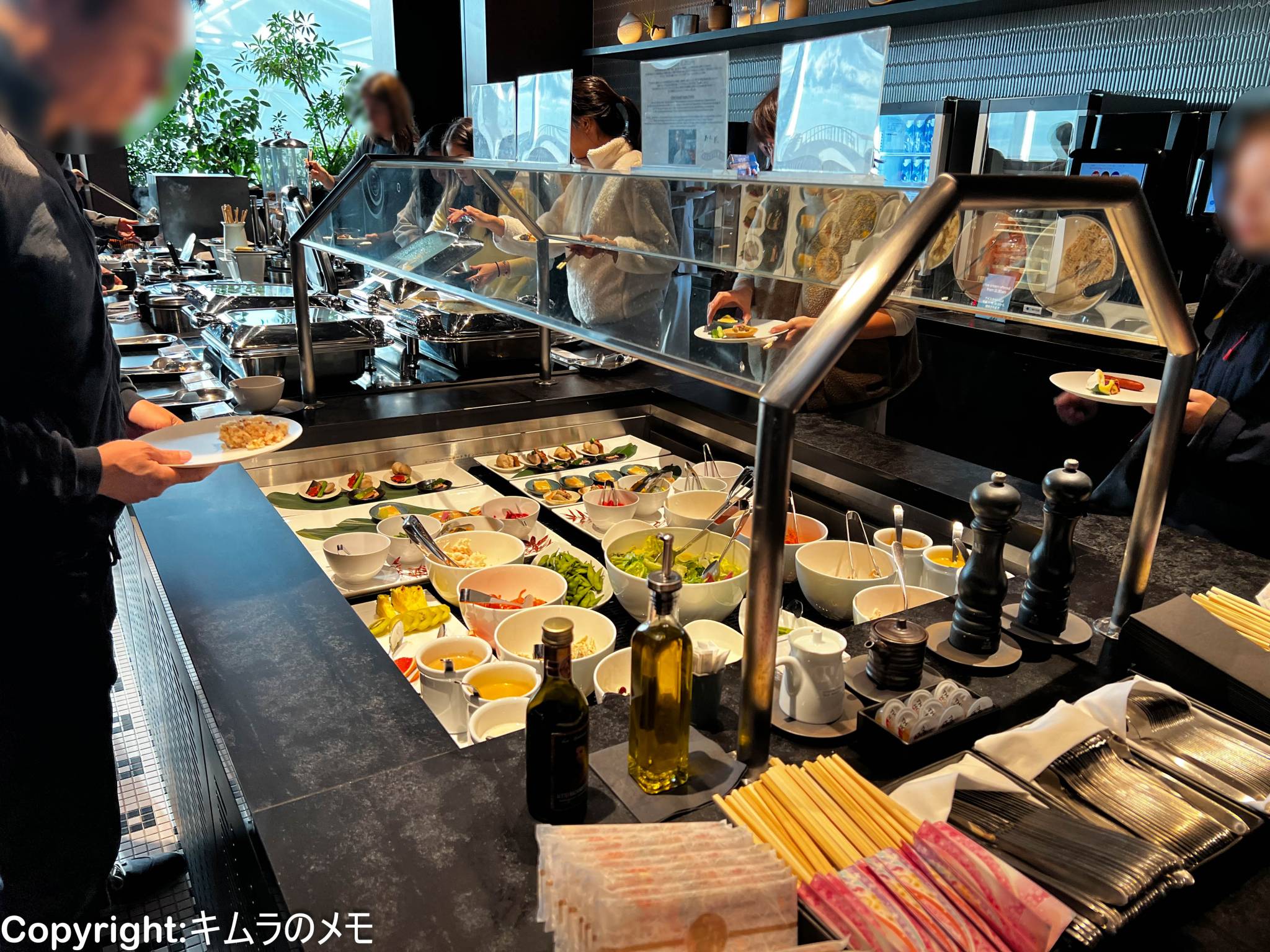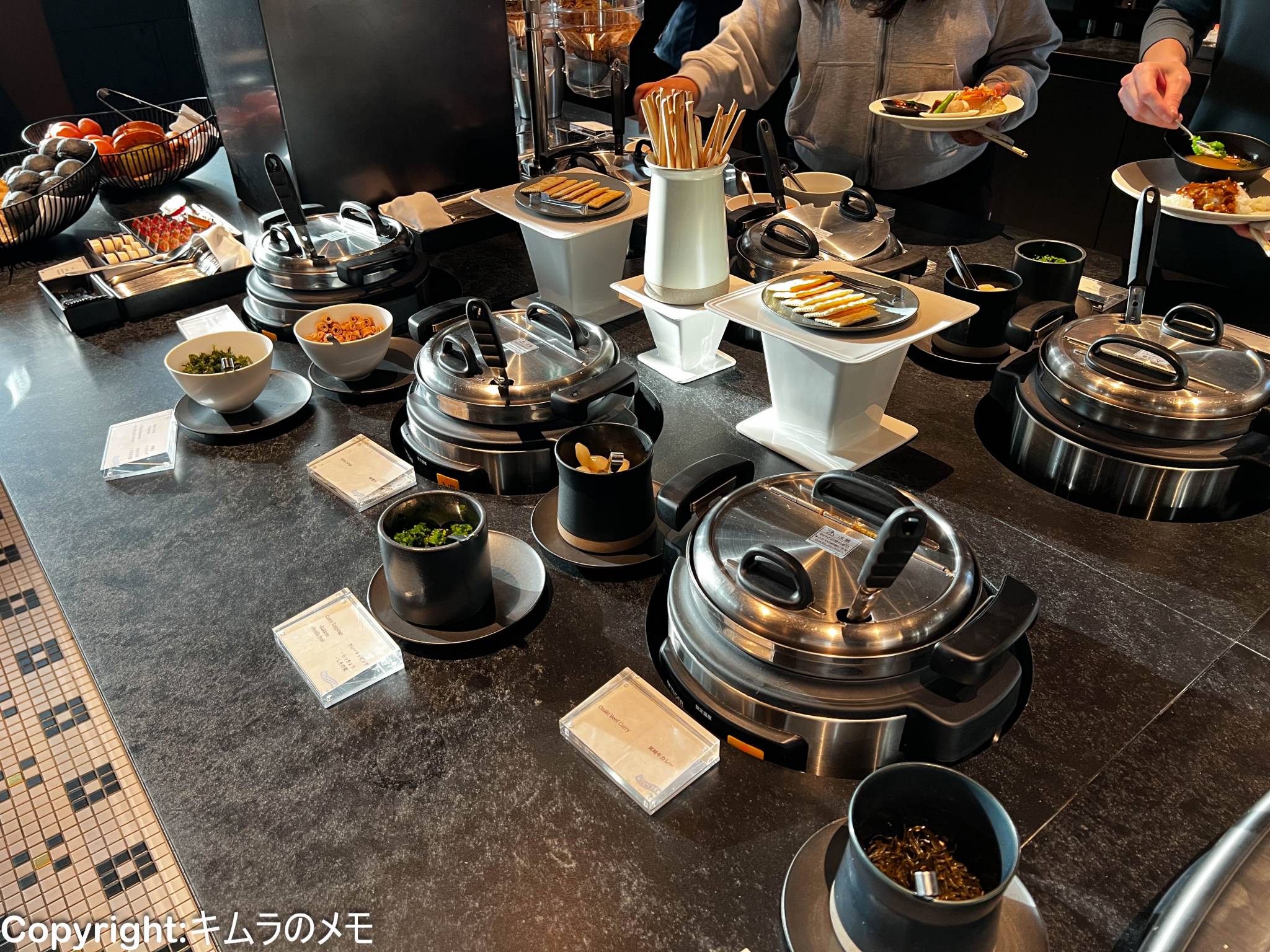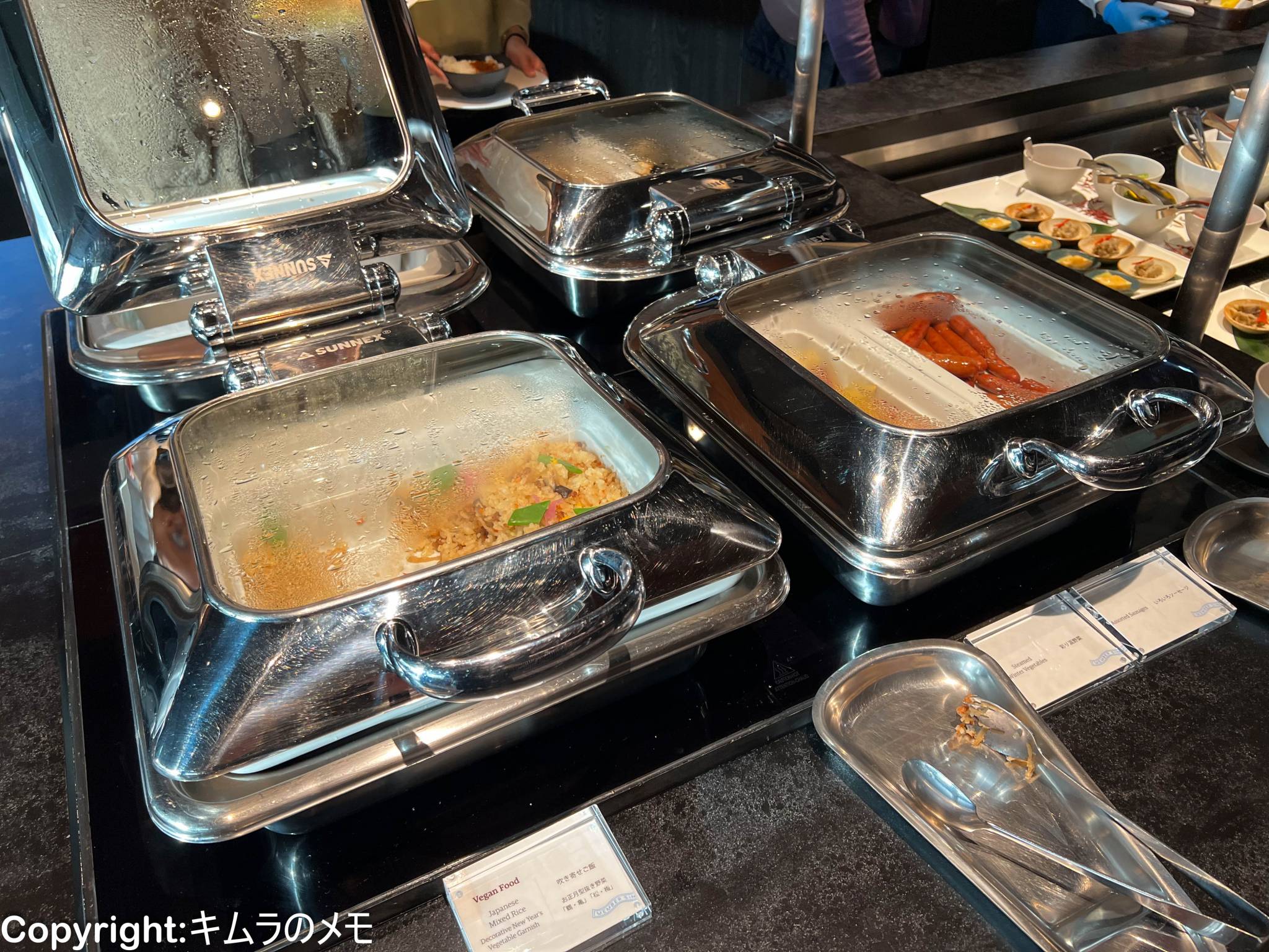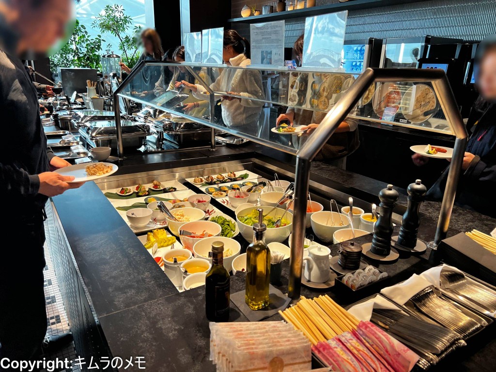 ビュッフェエリアはラウンジの一番奥にあり、冷菜、温菜、スープ、パンなどが提供されている。