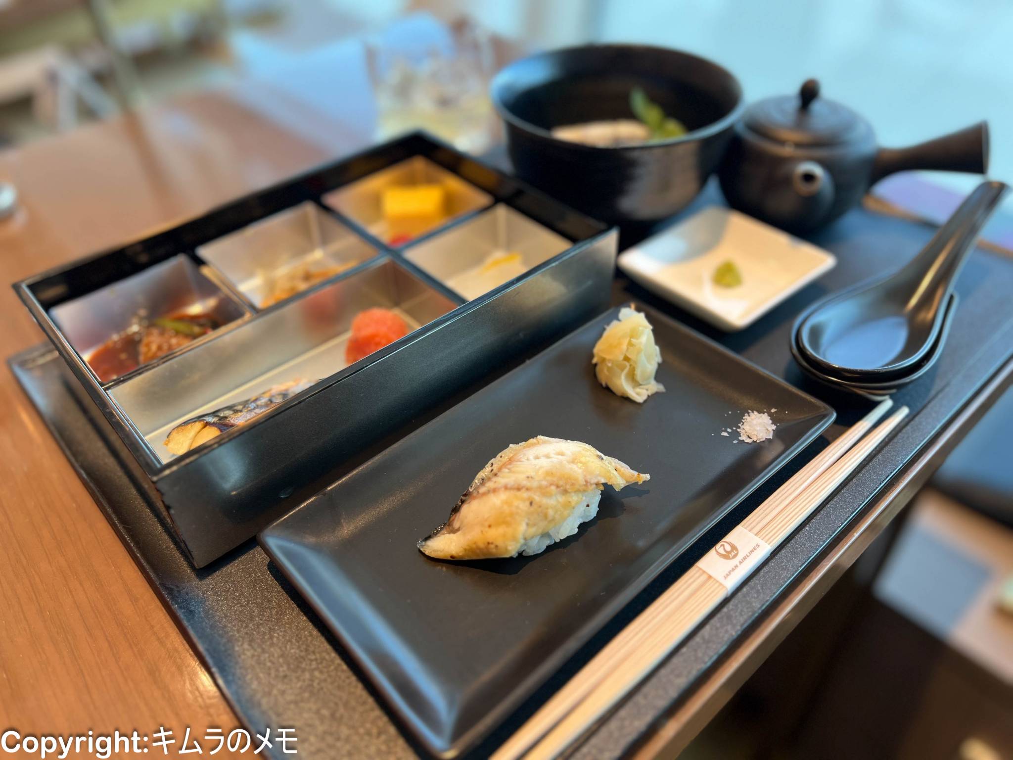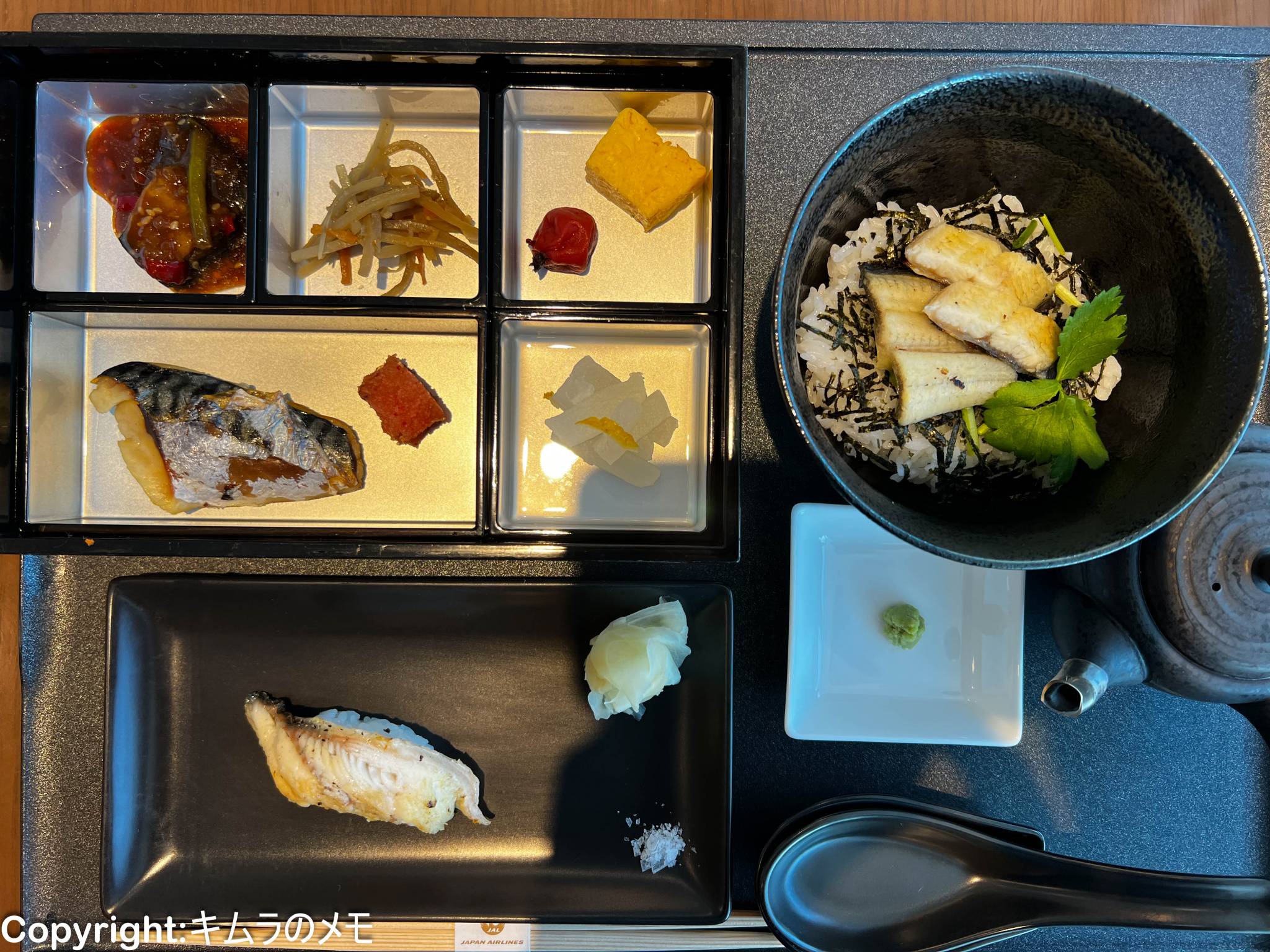 おせちとうなぎの白焼き握り、そしてお茶漬けが味わえるのは日本のエアラインの日本のラウンジならでは。