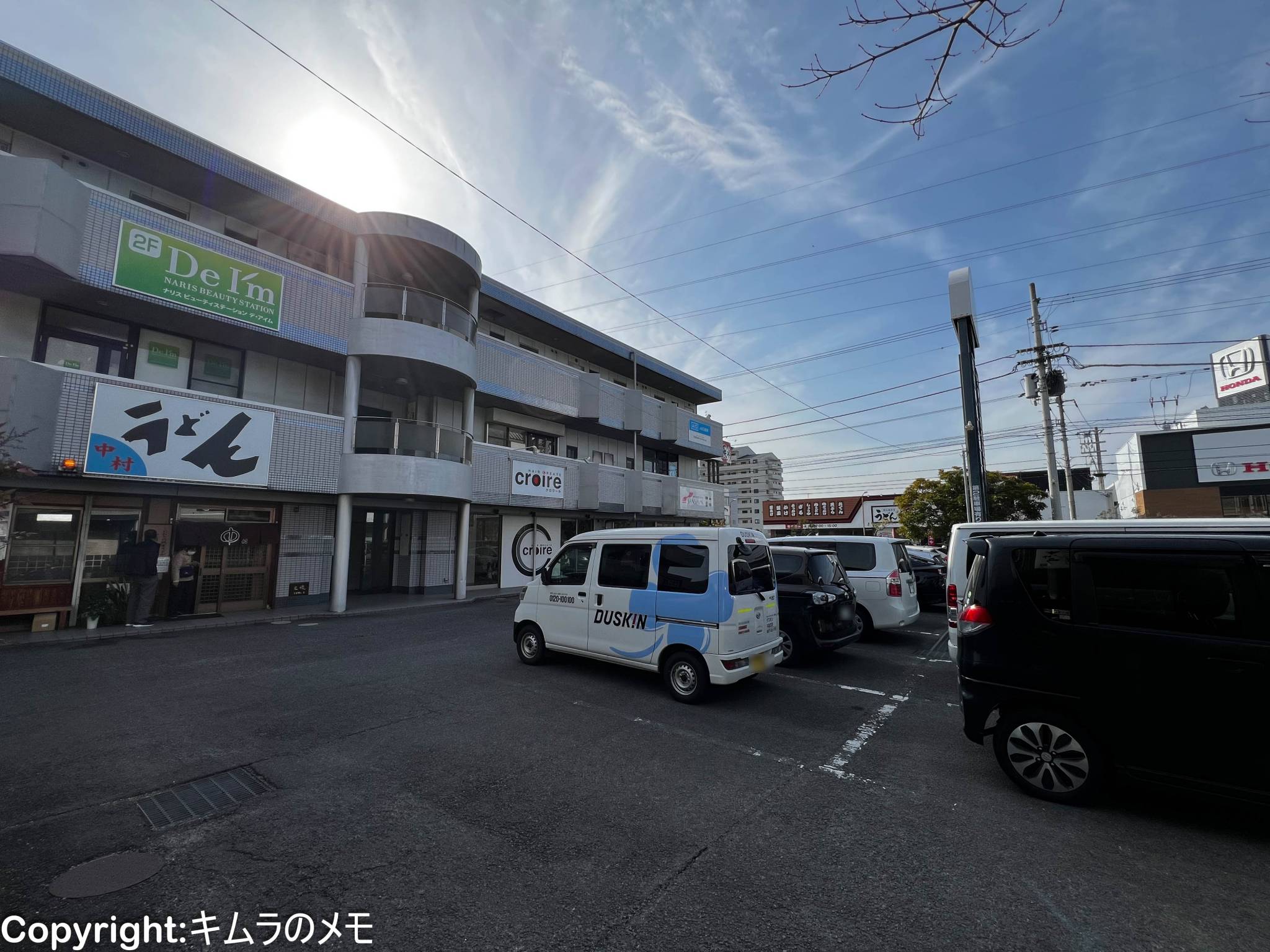 こちらは外観は2階建てのアパートのようなイメージだが、複数の飲食店や店舗が入店している建物となり、駐車場はその店での共有となり15台程度が確保されている。