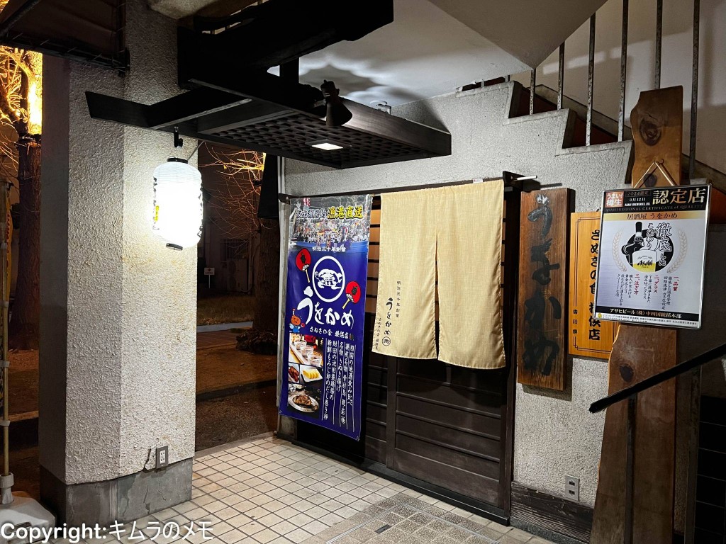 店先には「うをかめ」と書かれた暖簾が出ており提灯もあるのでそれが目印となる。