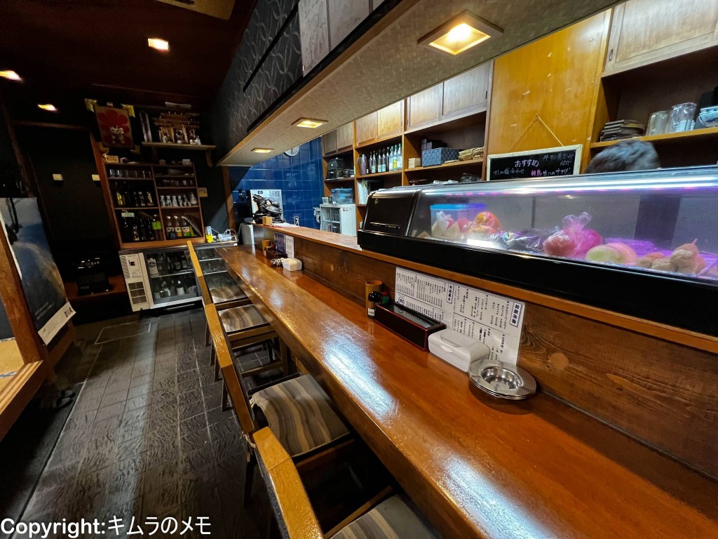 カウンター席は比較的ゆったりとしたスペース感となっており、昔ながらの居酒屋感がある造りになっている。