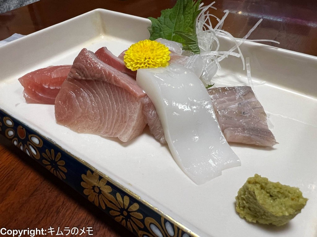 坂出瀬居島の漁港直送のイカ、マグロ、ブリなどの地魚の盛り合わせだが、量は少し少なめであった。