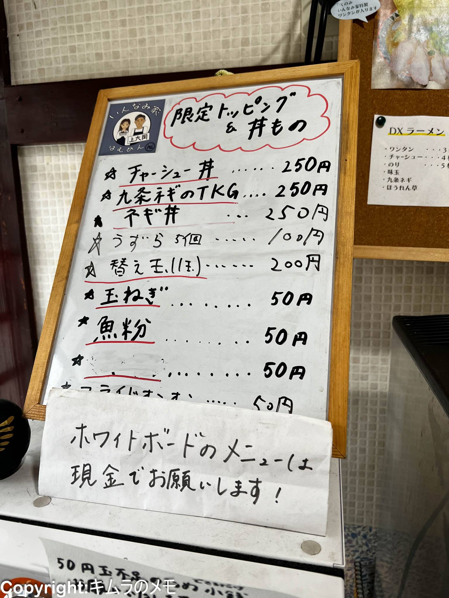 また、券売機以外にもホワイトボードに色々なメニューが書いてあるが、こちらは現金でのオーダーとなるよう。