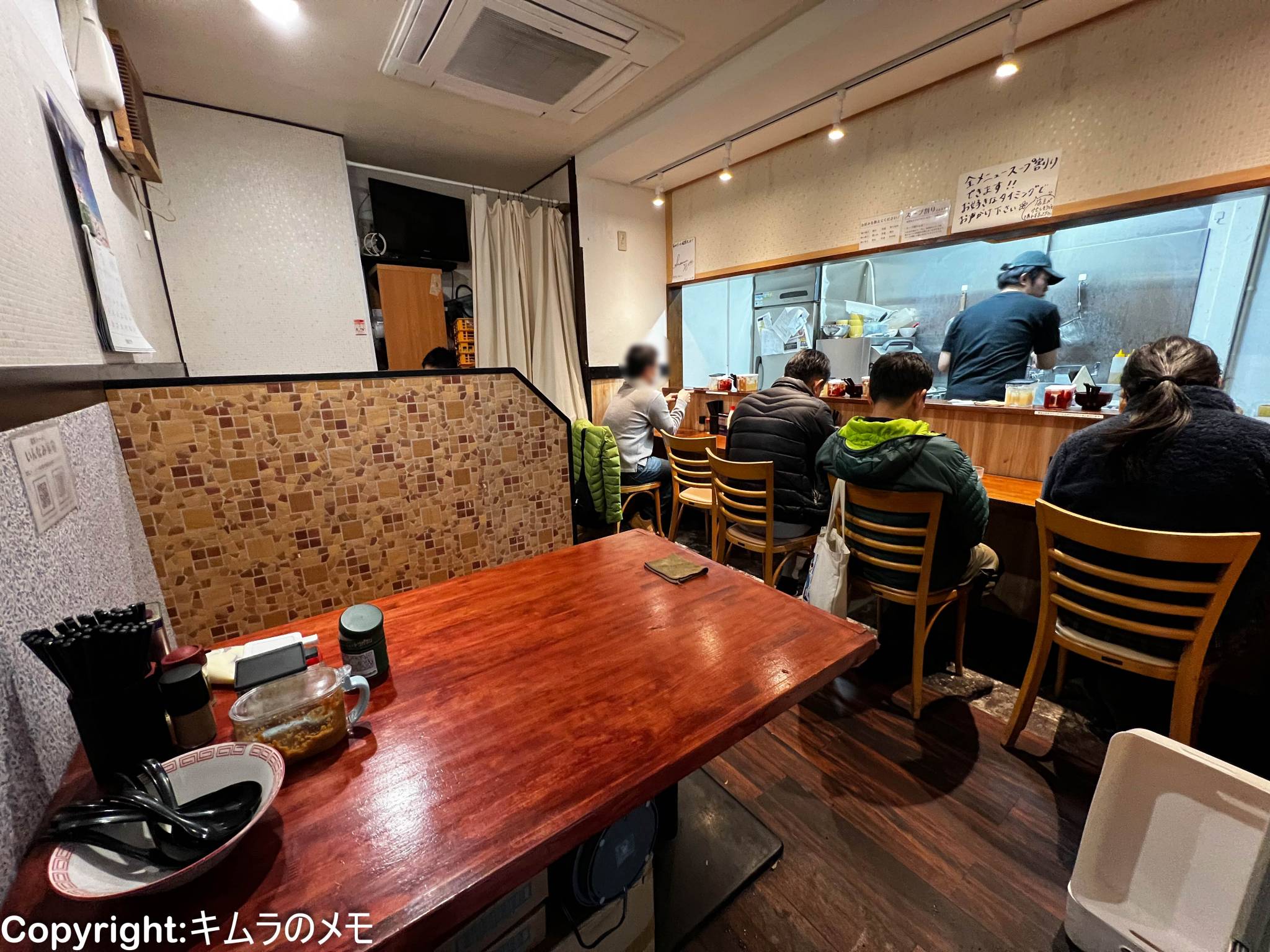店内は外観から想像できる通りの雰囲気で、なかなか年季が入った感じとなっており、カウンター席が5席と4名のテーブル席が1卓、そして横並びで座る2名用のテーブル席が1卓と、トータルキャパは10名程度。