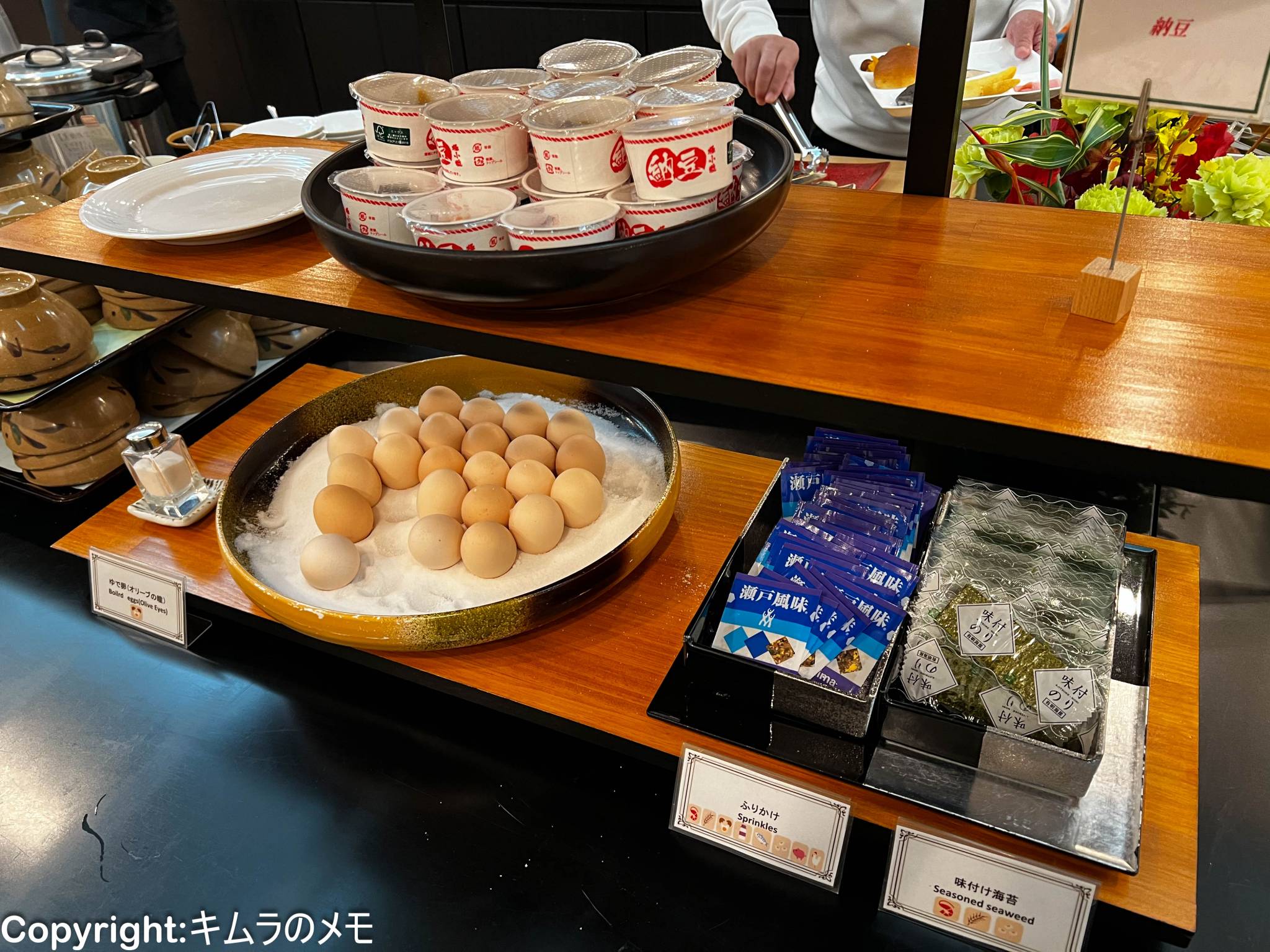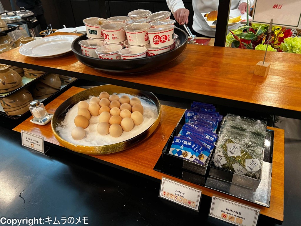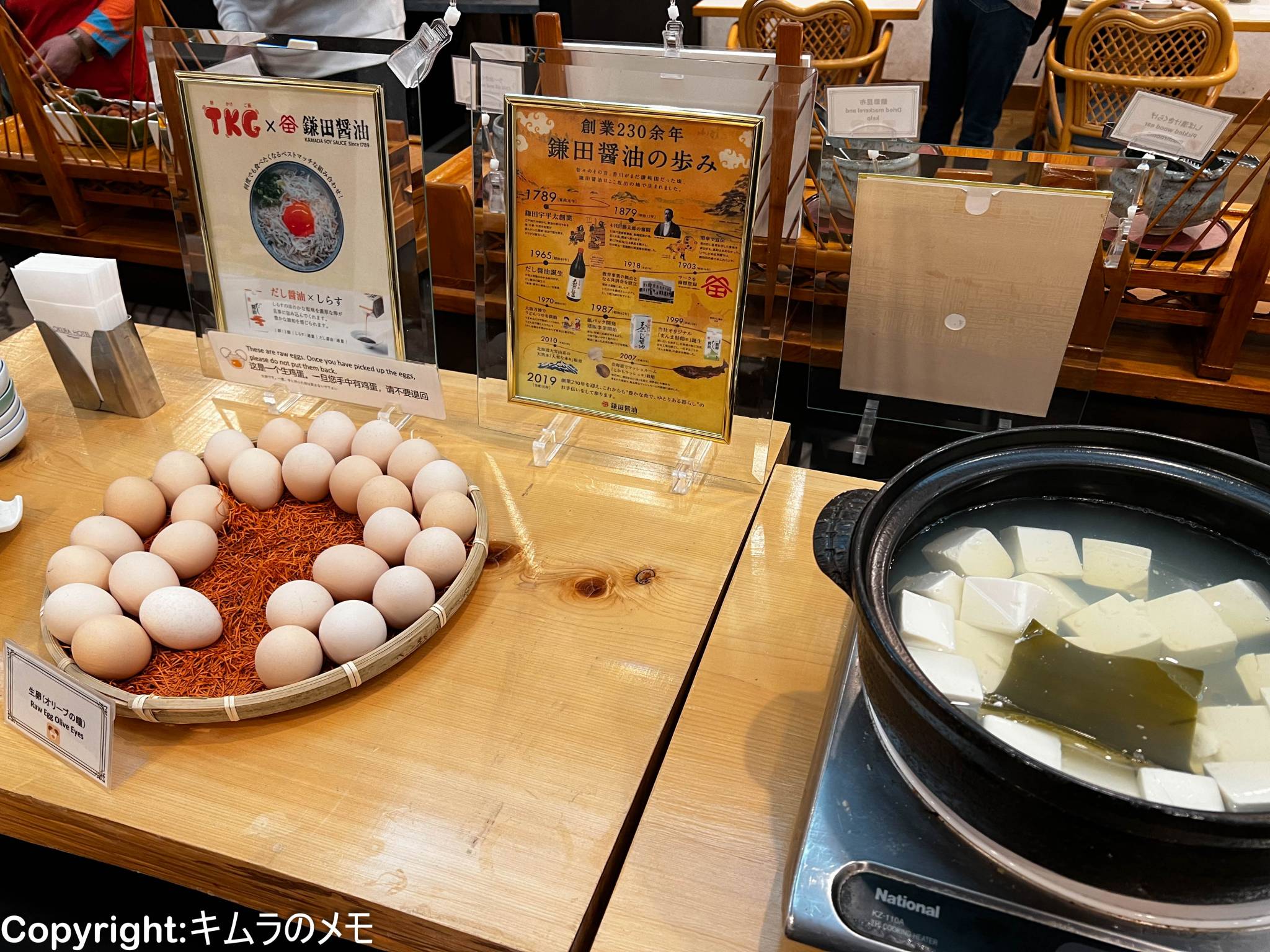 一方で、卵は朝食ビュッフェにしては珍しい生卵も用意されており、こちらは「オリーブの瞳」という香川県のブランド卵が同じく地元のの老舗醤油メーカーである鎌田醤油の醤油と共に用意されている。
