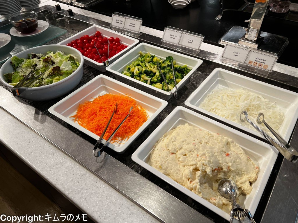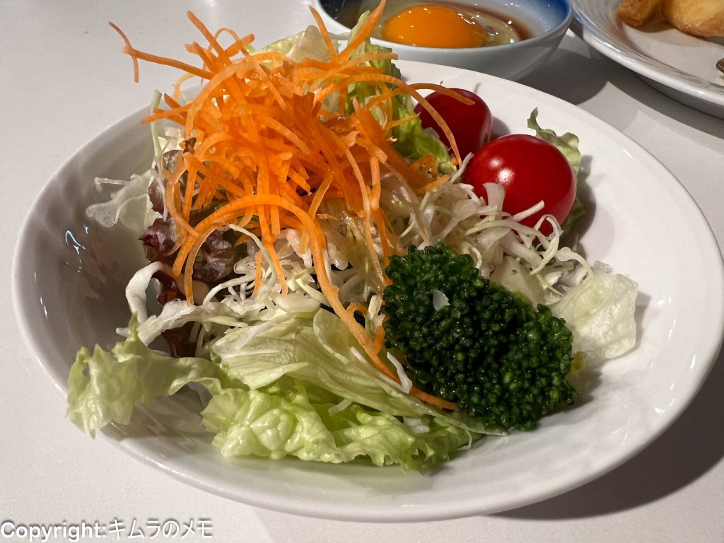 サラダは葉物の他に数種類が用意されているが、葉物は千切りキャベツだけでなくレタスなどもミックスされたもの。