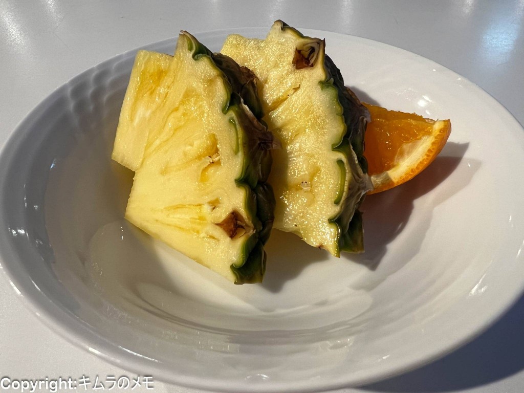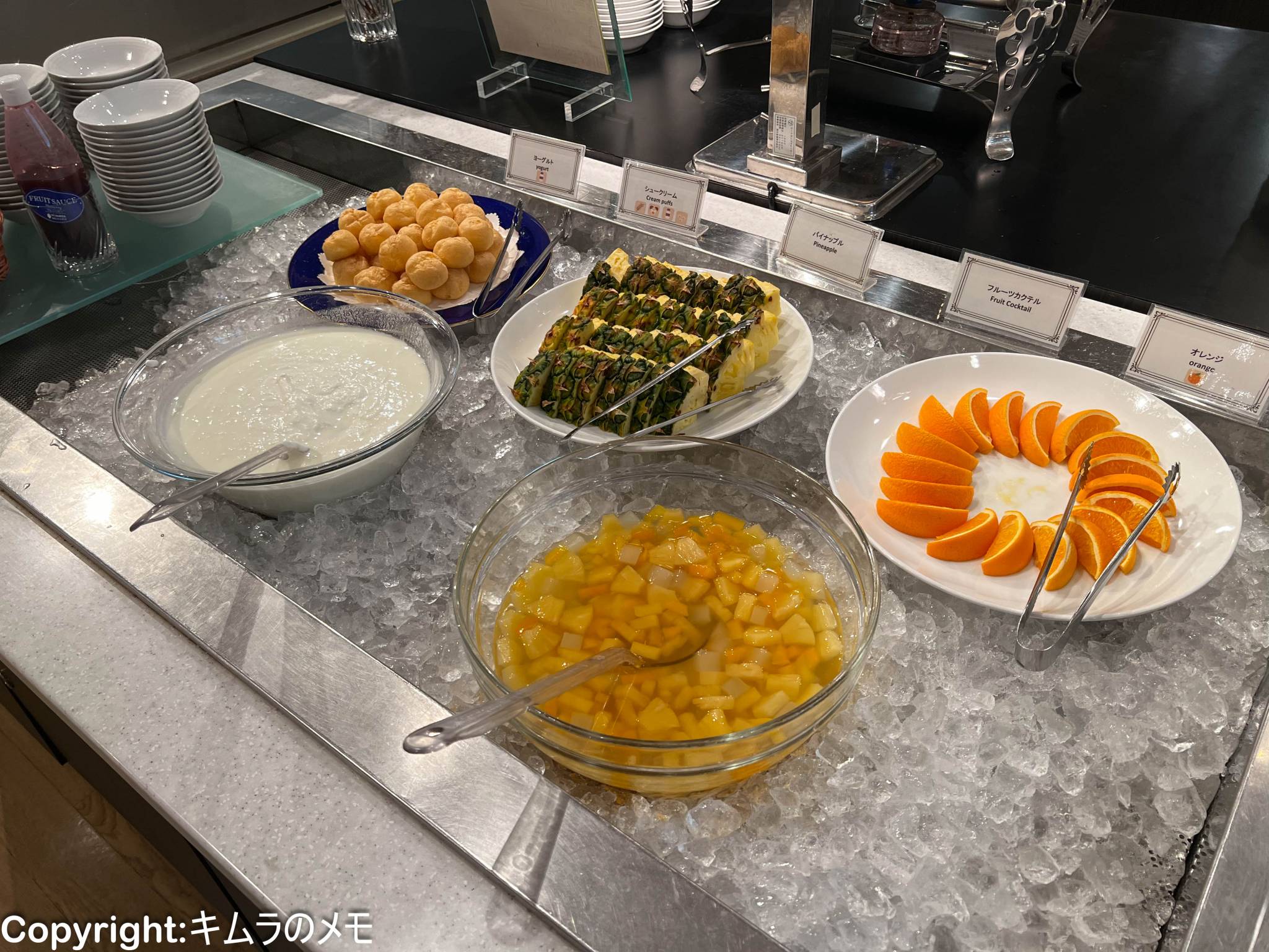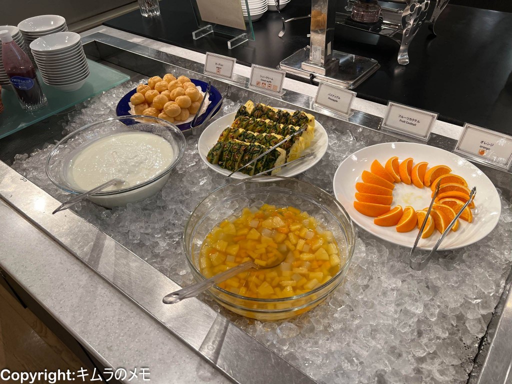 フルーツはカットフルーツとしてパイナップルとオレンジの2種類だけだが、シュークリームも用意されている。