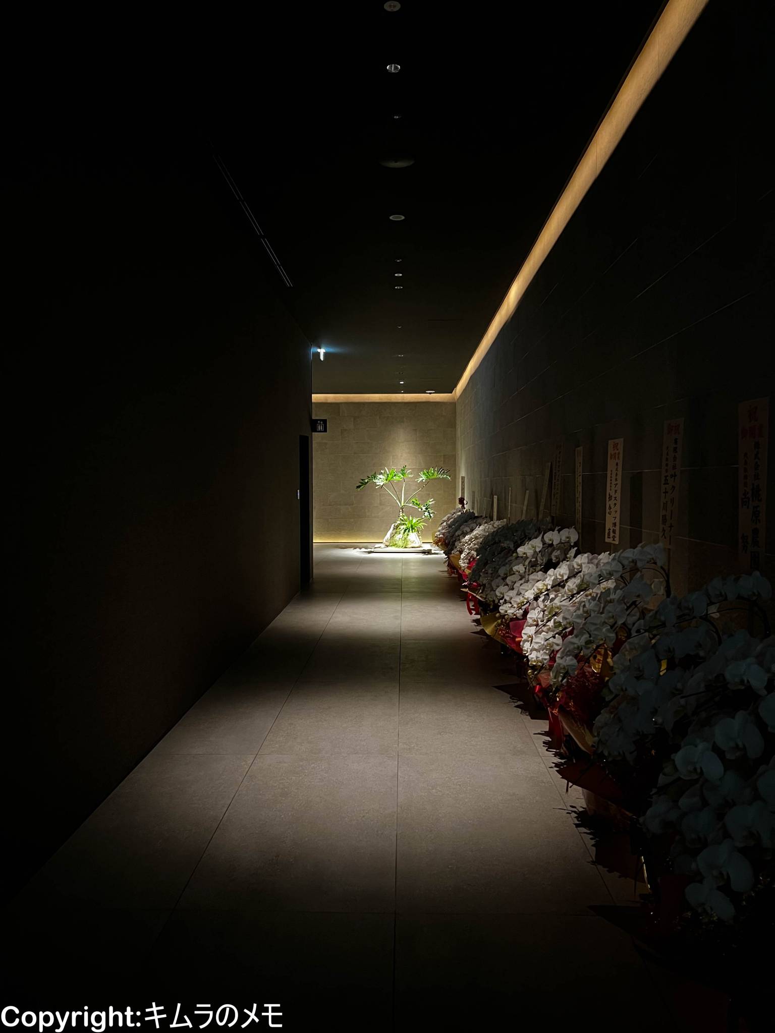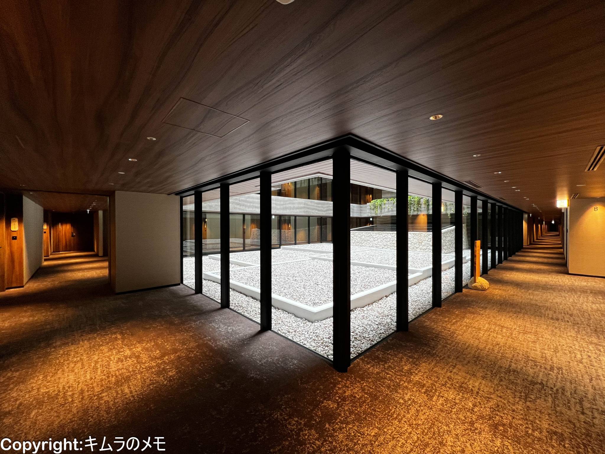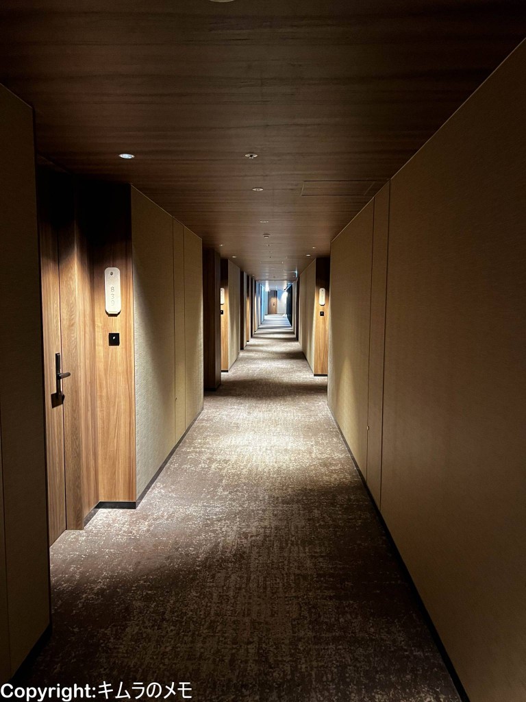 エレベーターホールから客室に向かうが、照明は落とされ落ち着いた雰囲気になっている。