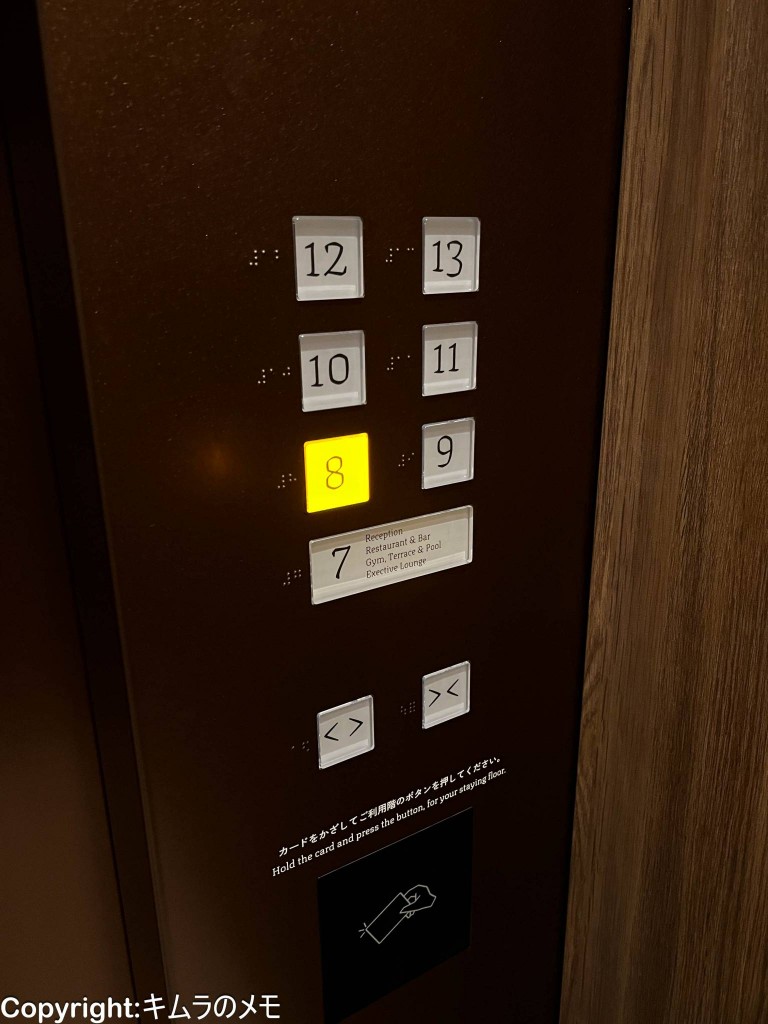 エレベーターは客室のカードキーをかざしてからフロアを選択するタイプとなっている。