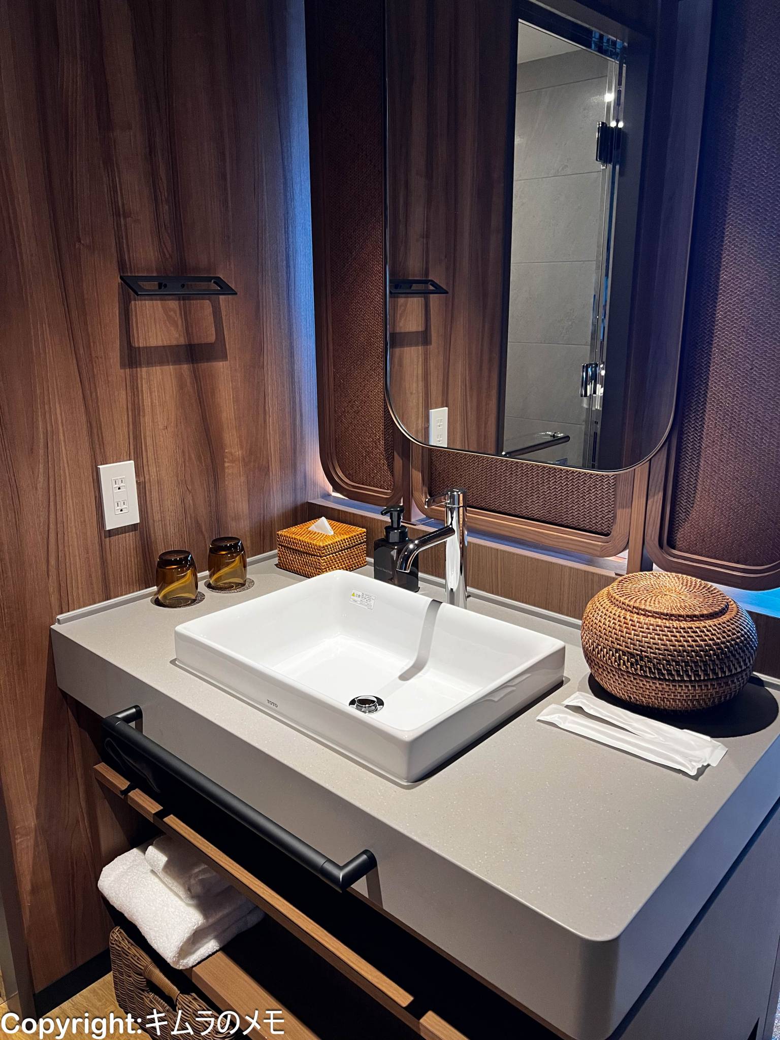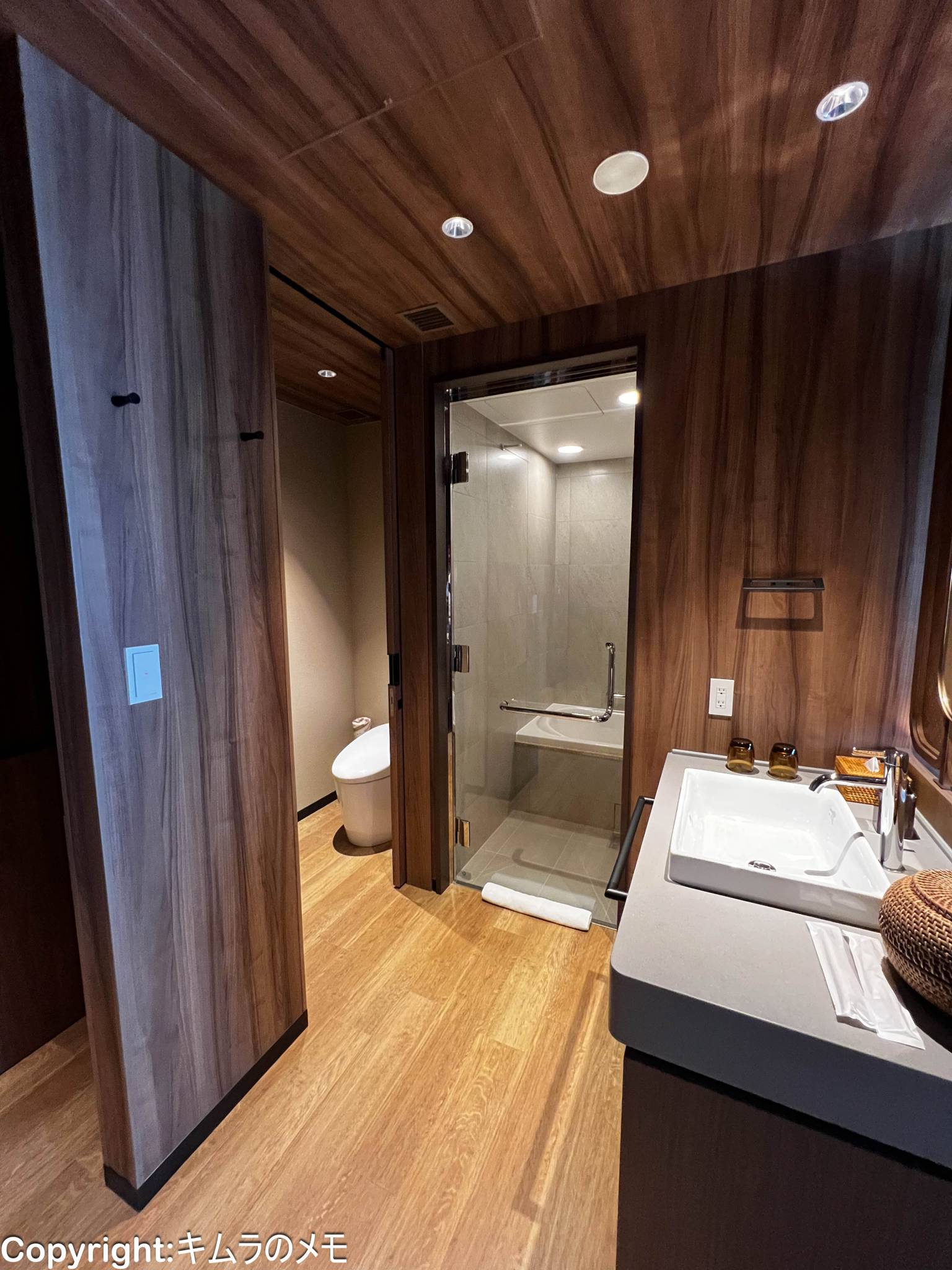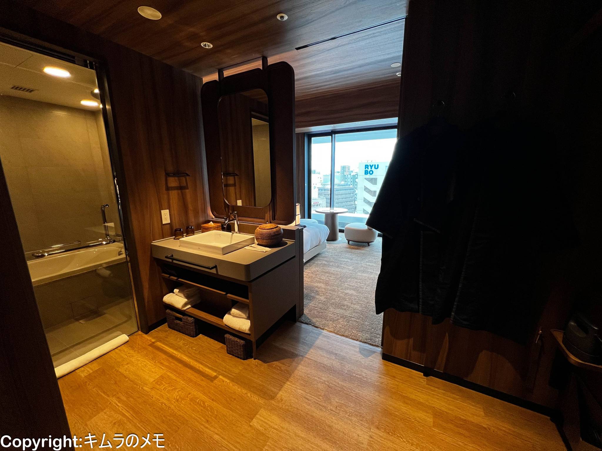 さて水回りだが、部屋の造り自体が一般的なホテルと異なり、入口側が水回りエリア、窓側が客室エリアとなっている。