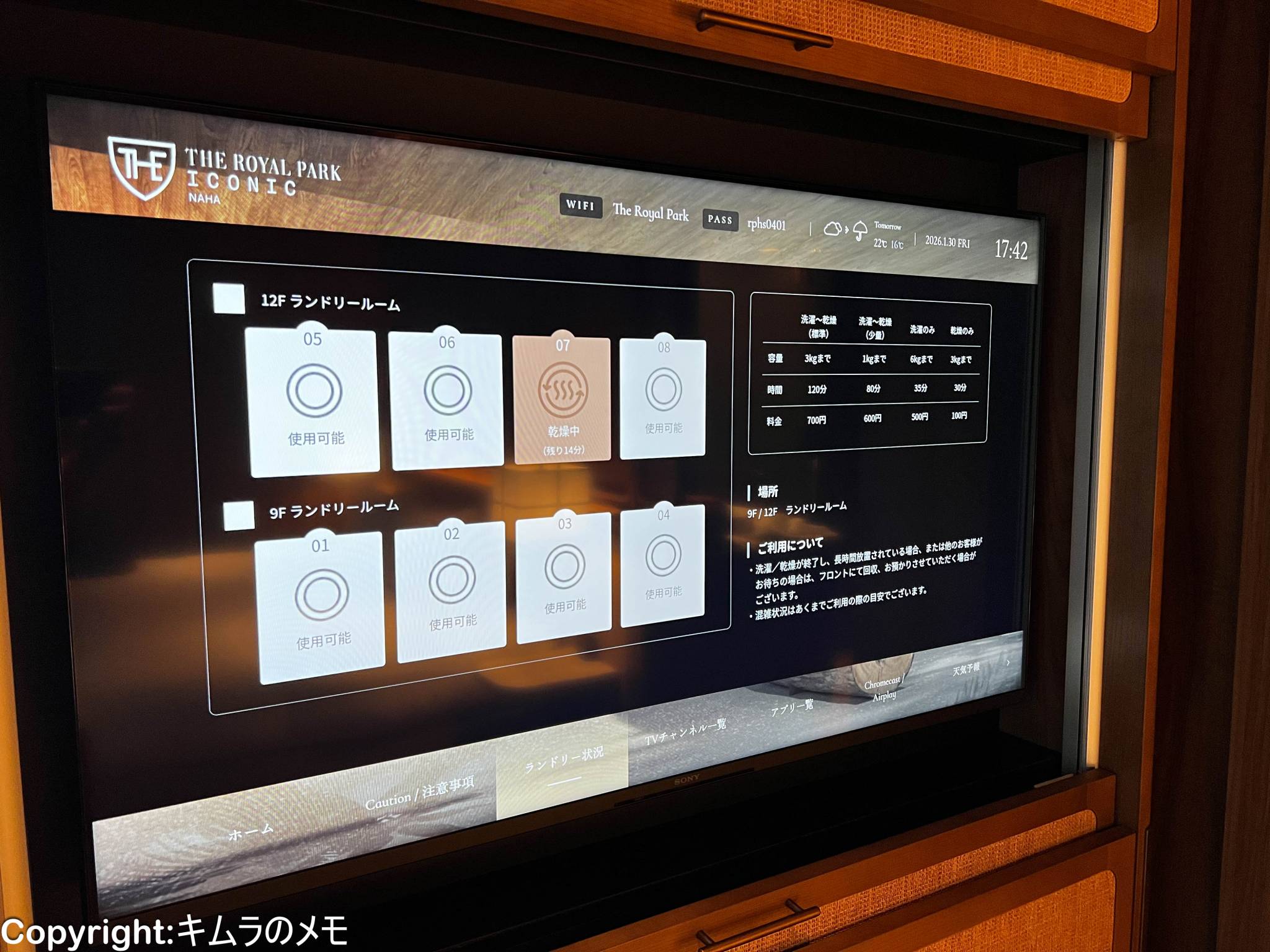 なお、テレビではホテル内にあるランドリーの空き状況をリアルタイムでチェックすることが可能。