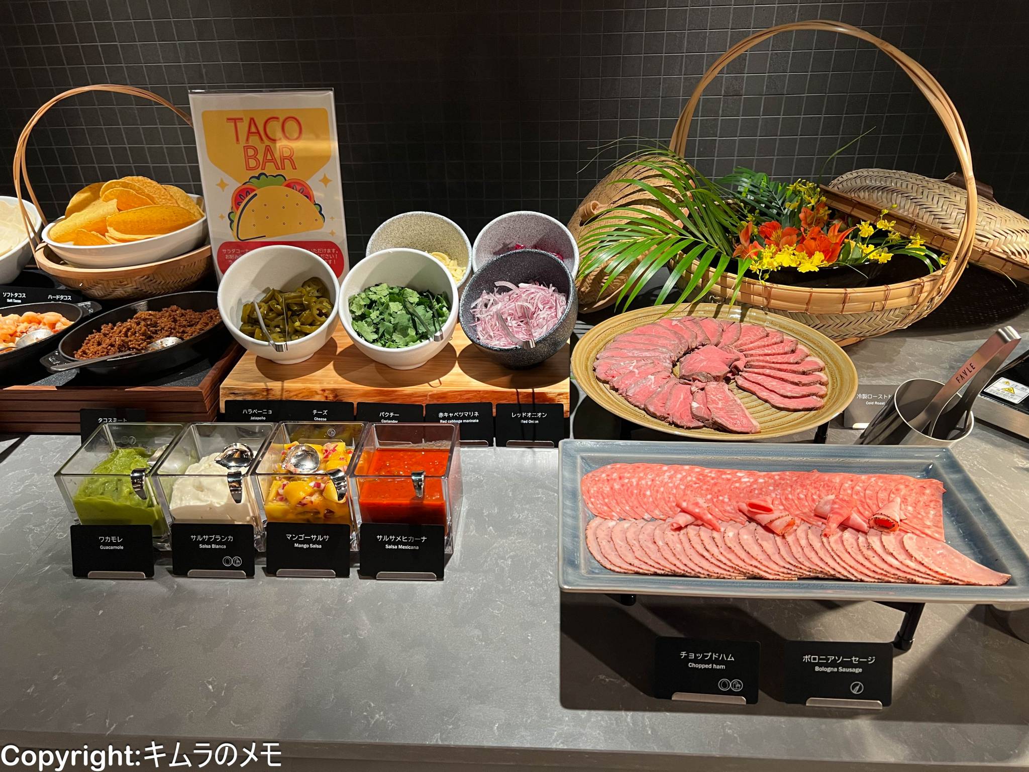 その横にはセルフサービスで作るタコスや、ローストビーフなど、クオリティーの高い冷菜が用意されている。