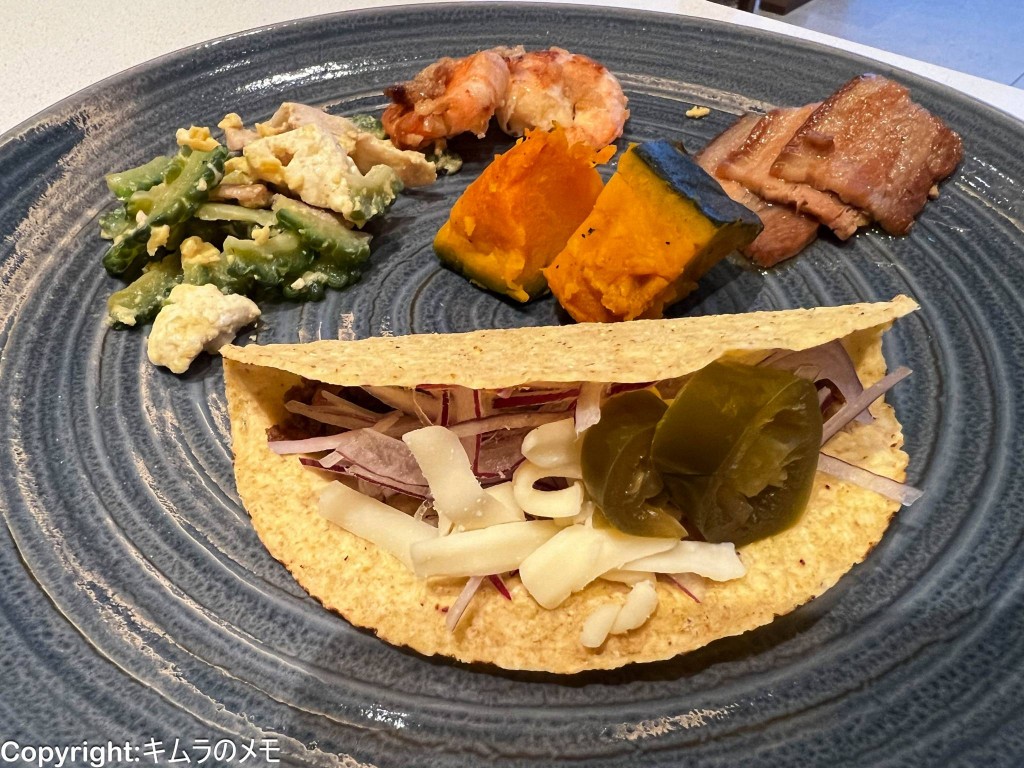 沖縄料理、タコスなどを楽しめるタコバー、洋食、ライブキッチンというのがメインの料理のよう。