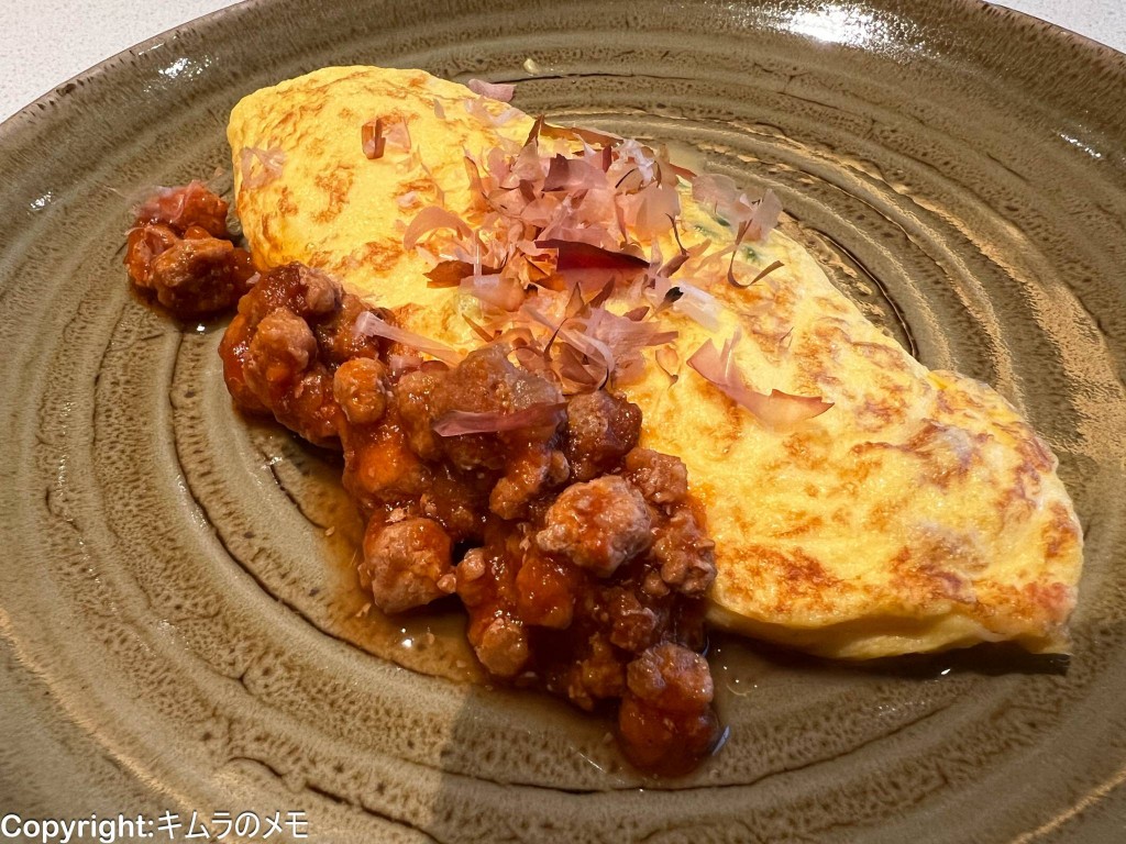 沖縄らしく、出汁をしっかりと効かせたオムレツとあぐー豚を使ったトマトソースを合わせて楽しめる。