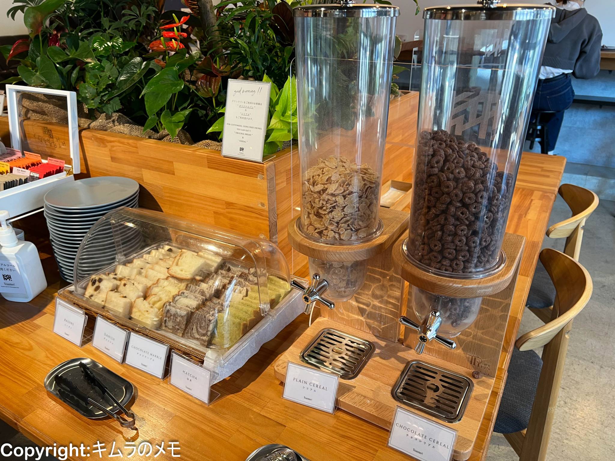 な、それぞれメニューは単品かセットでのオーダーが可能だが、セットにするとドリンクとお店オリジナルのパン、そしてシリアルが食べ放題となる。