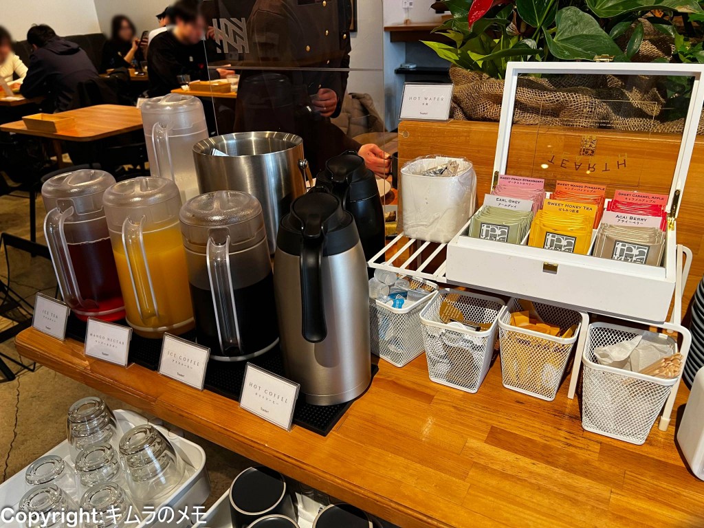 ドリンク類も充実しており、ホット・アイスコーヒーの他に紅茶やオレンジジュース、牛乳も用意されている。