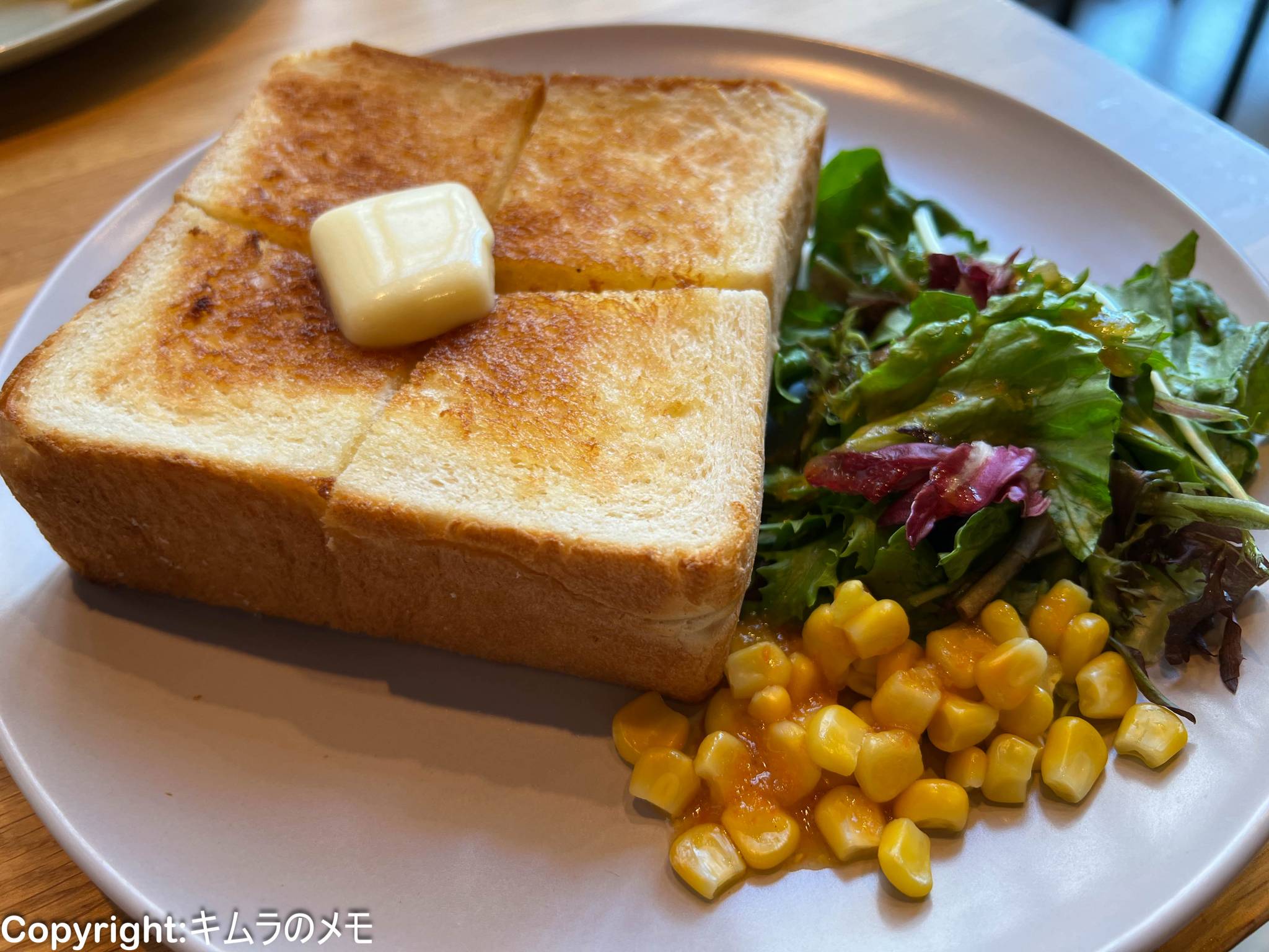サラダとコーンに厚切りトーストと、とてもシンプルではあるが、トーストは市販の4枚切り程度の厚みがあり、その上には大きなバターがひとかけら乗せられている。