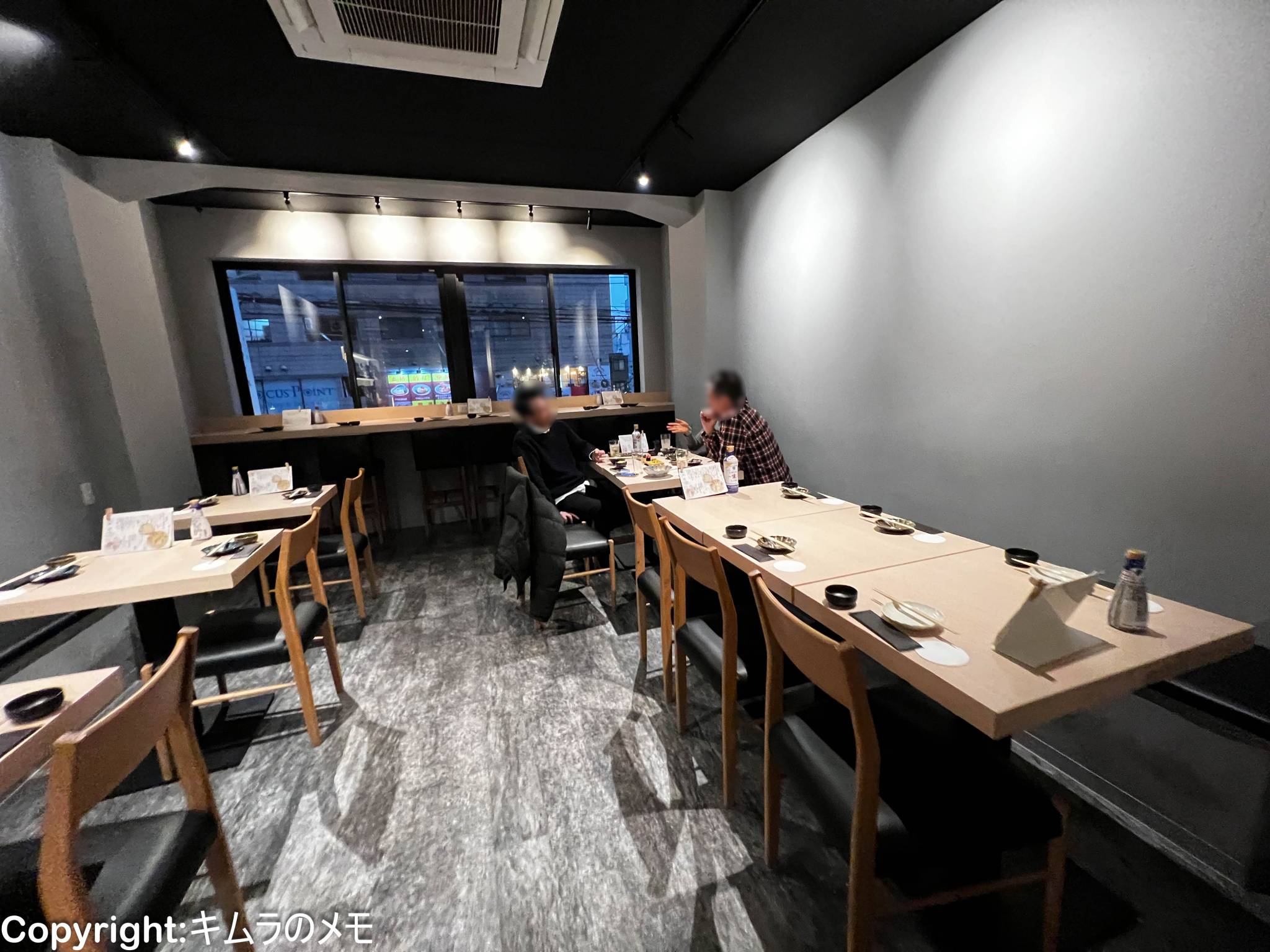 2名テーブルが7卓、カウンター席が4席で座席数としては20席少々、立ち飲みコーナーを入れて25席程度とこぢんまりとしたサイズ感となっている。