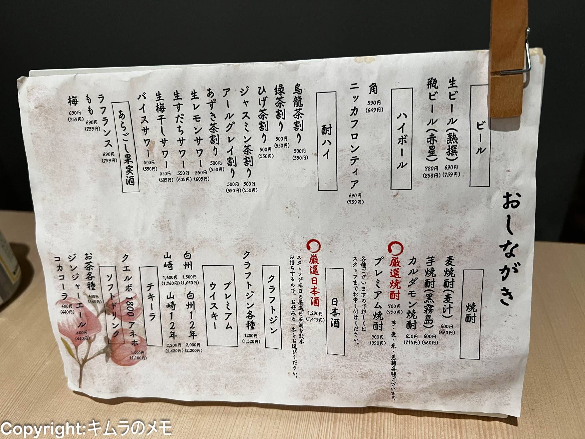 ビール、ハイボールなど一通り揃っているが日本酒やクラフトジンが推しのよう。