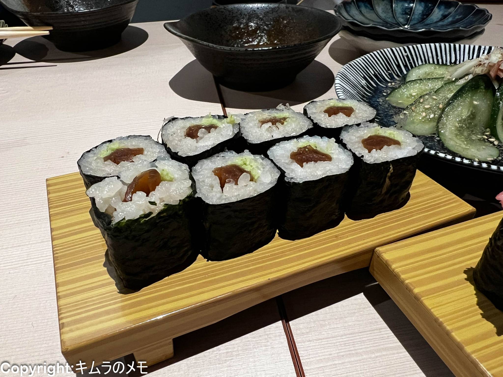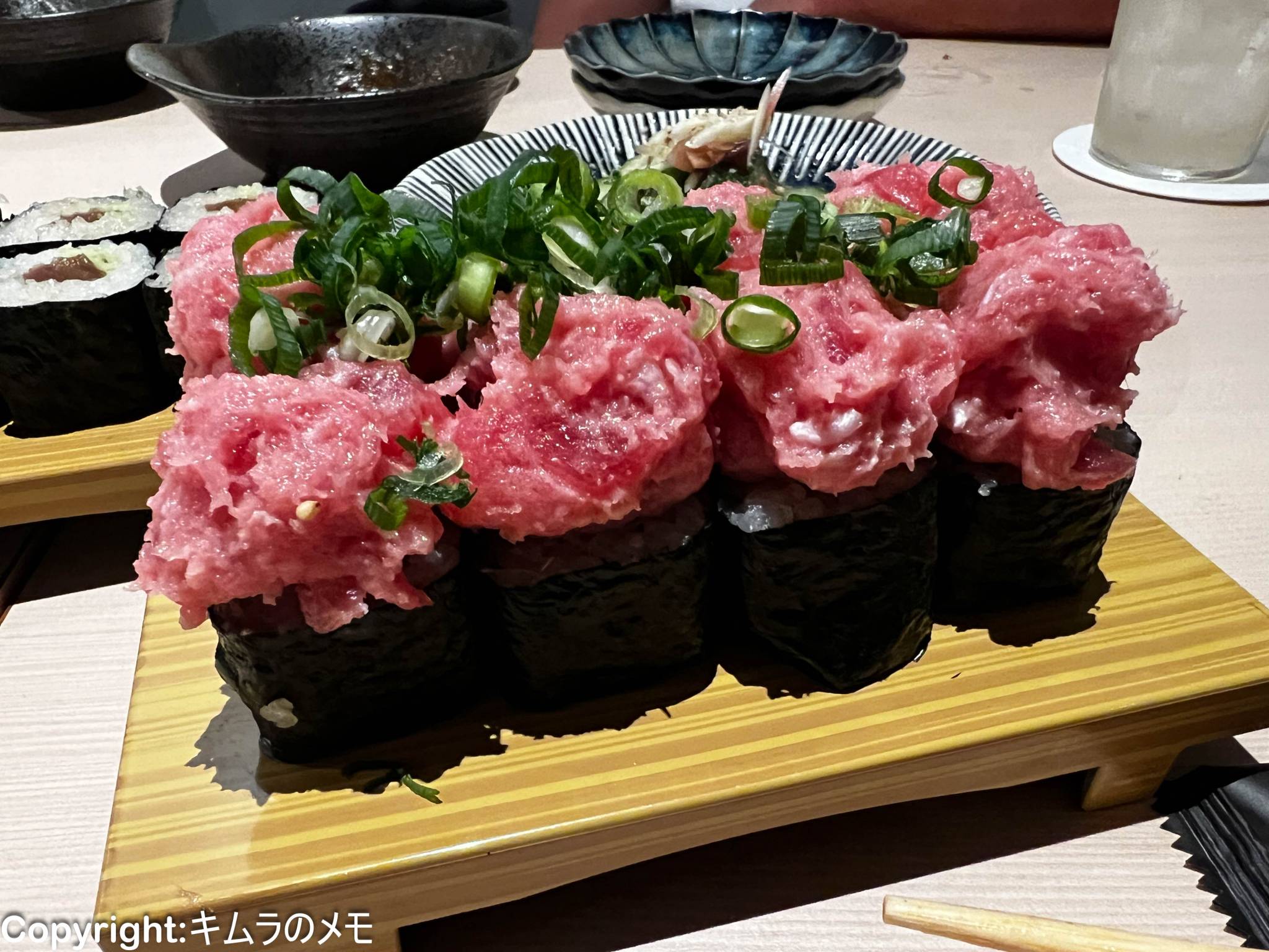 言ってしまえば寿司の細巻きのトロタクと同じ具材を使っているのだが、こちらの店では少し細目にまかれたたくあんの細巻きの上に、たっぷりとネギトロが盛られたビジュアル的にも迫力のあるもの。