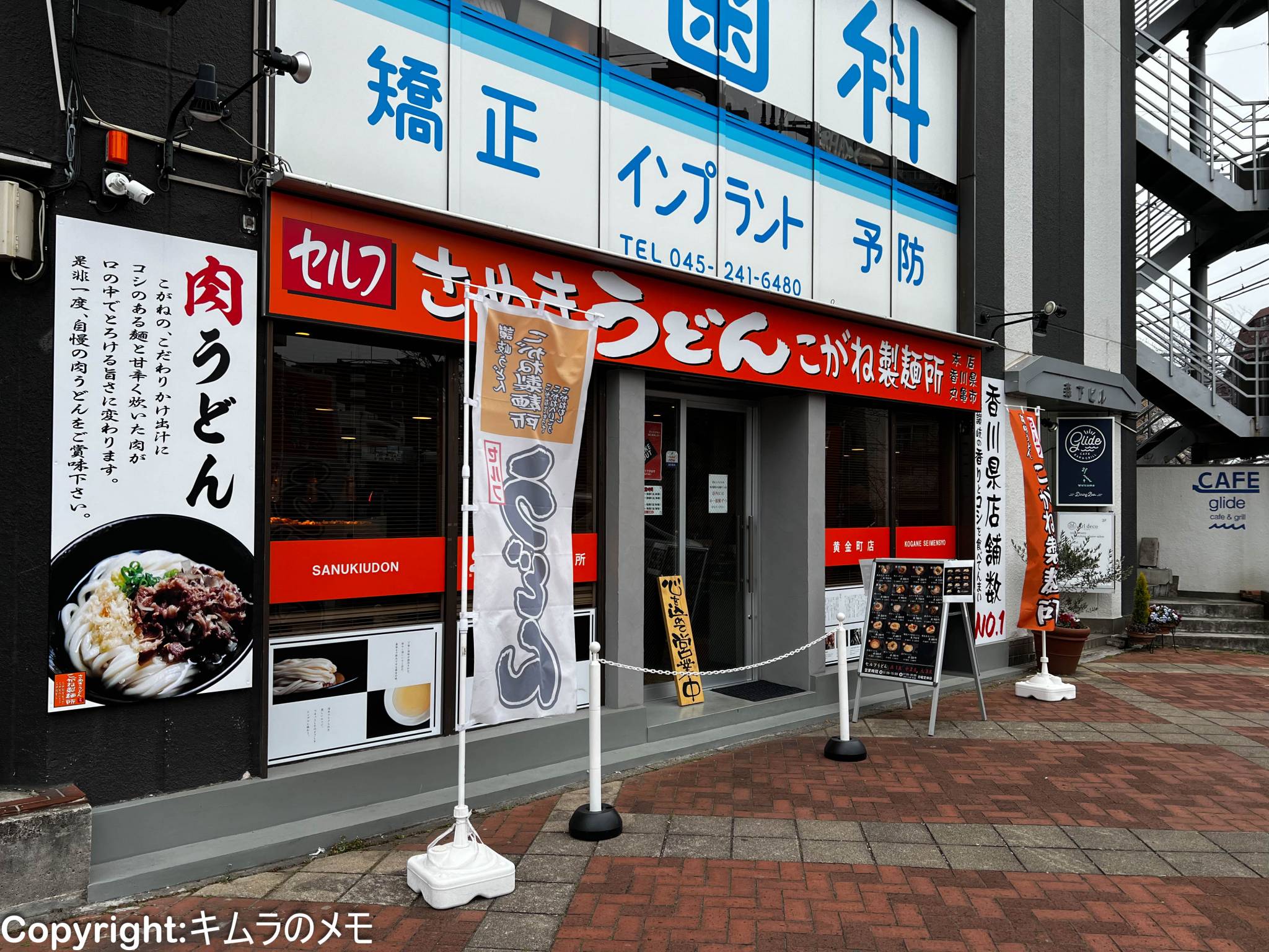 店舗前は公共スペースになっており、うどんののぼりも出ているので、横断歩道を渡れば必ず目に入ってくる立地。