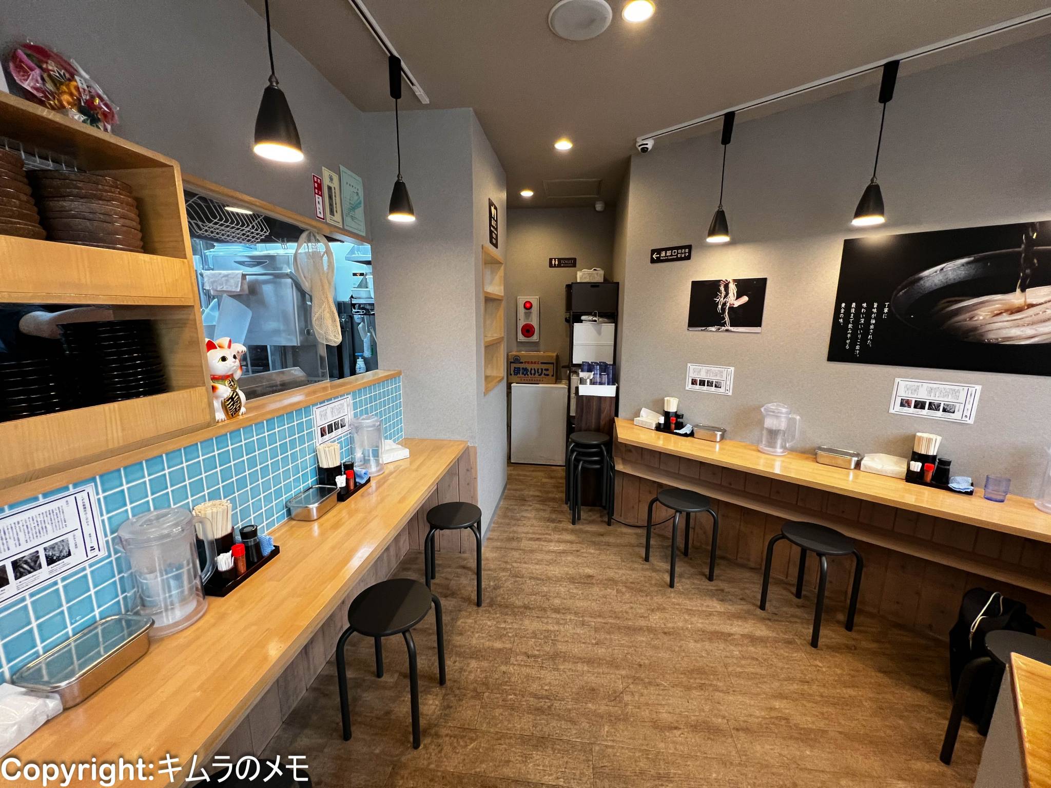 店舗内は少し変則的な形をしており、入口を抜けると目の前には厨房が広がり、客席は左右に分かれて配されている。