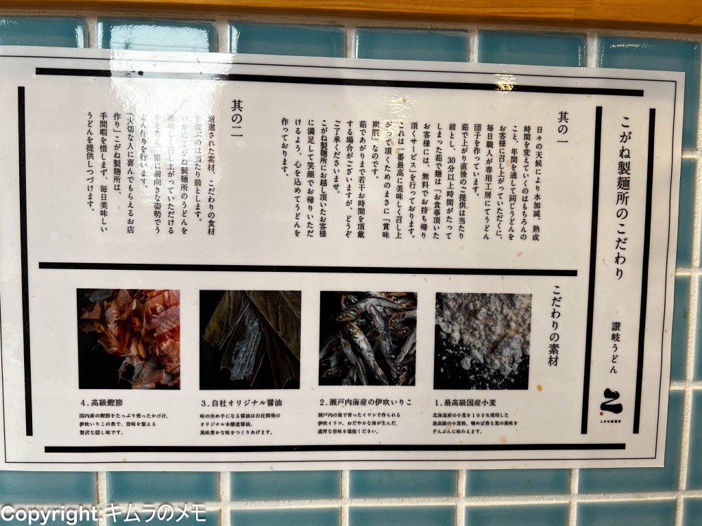 各席にはこちらのお店のこだわりポイントが書かれているので、うどんが提供されるまでの間に予備知識として入れておくのも良いかも知れない。