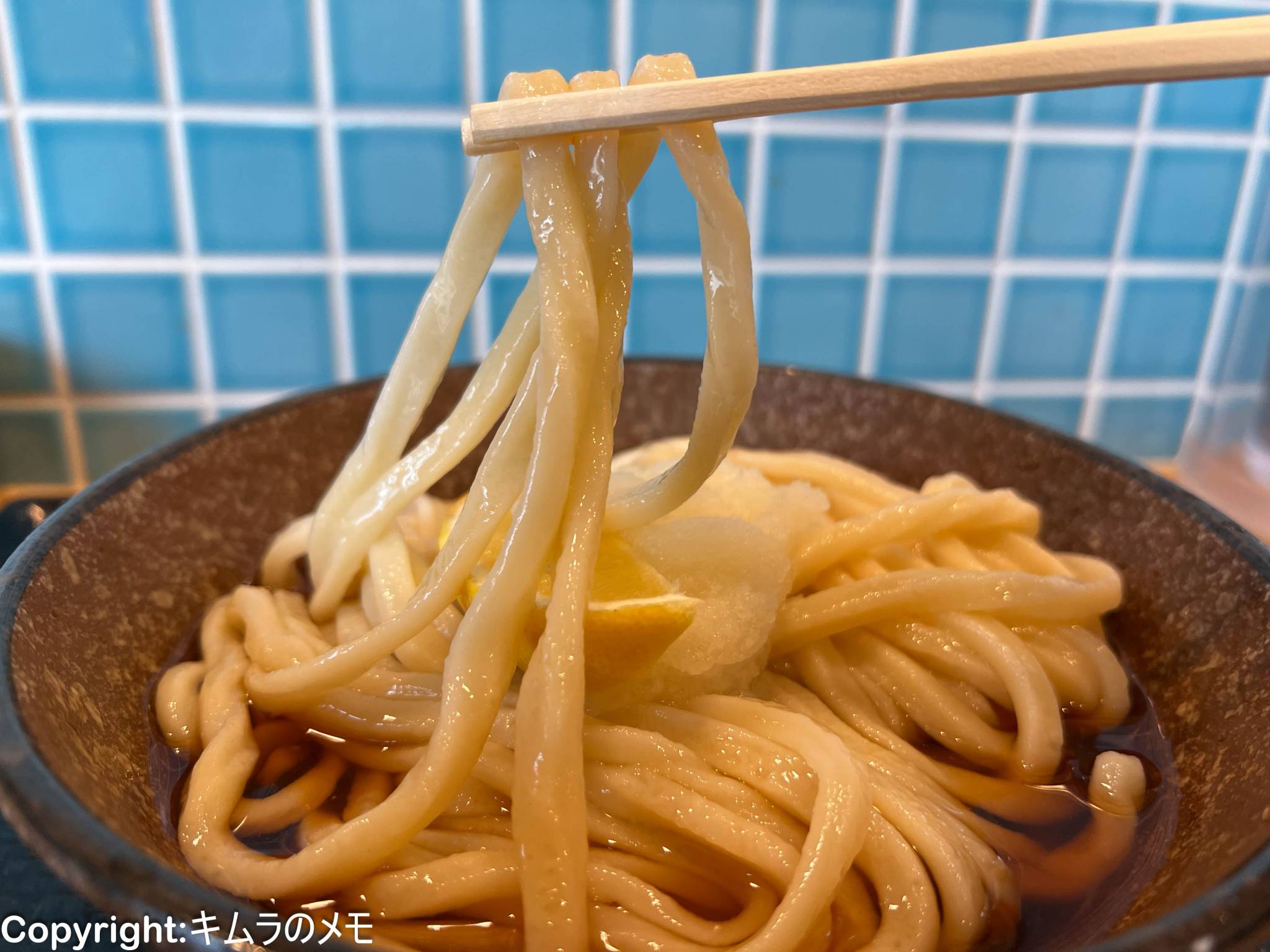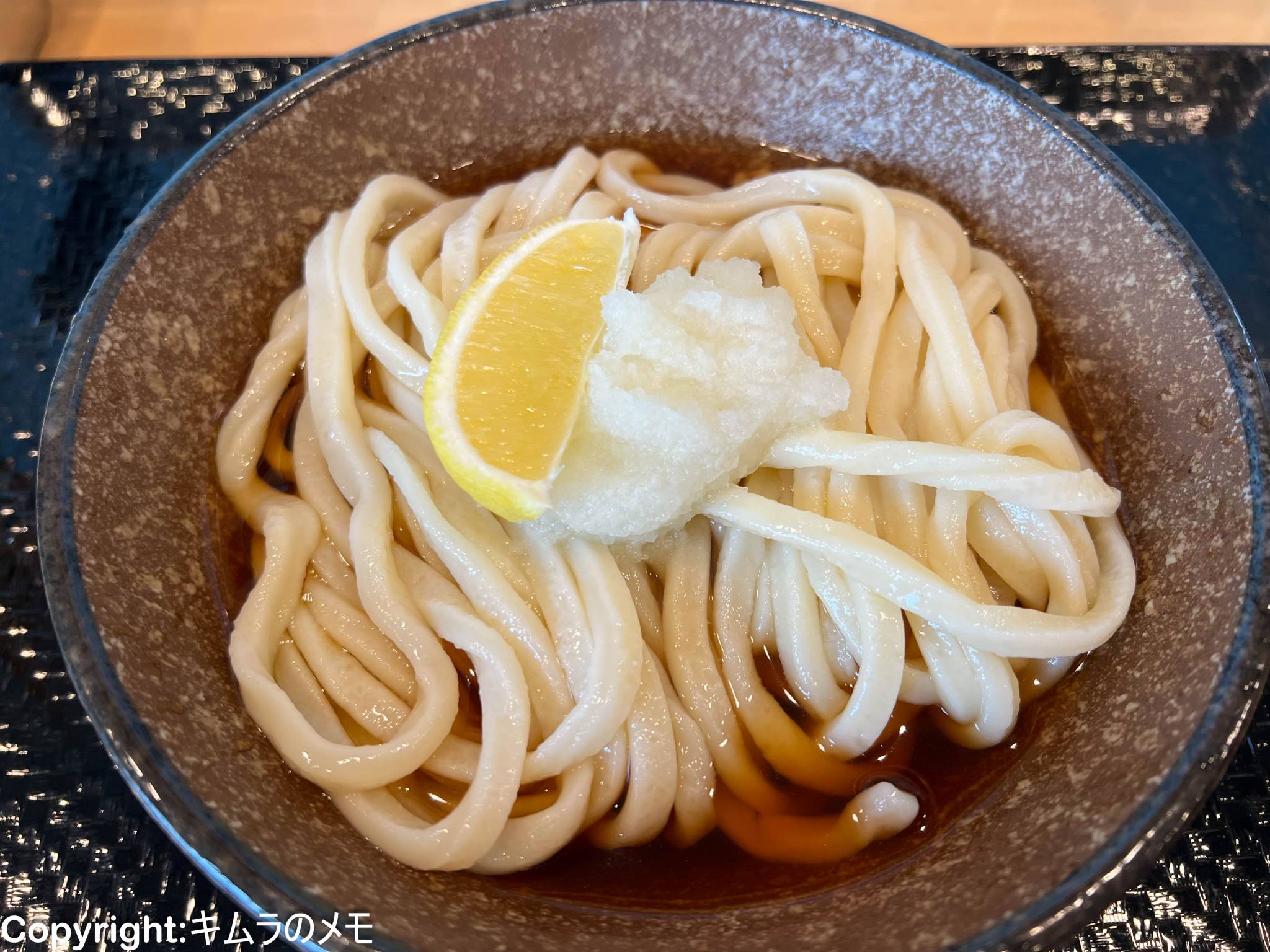 ツヤツヤのうどんの上には大根おろしとカットレモンが乗せられ、その下はに少し色が濃いめのだし汁がたっぷりと注がれたシンプルなビジュアル。