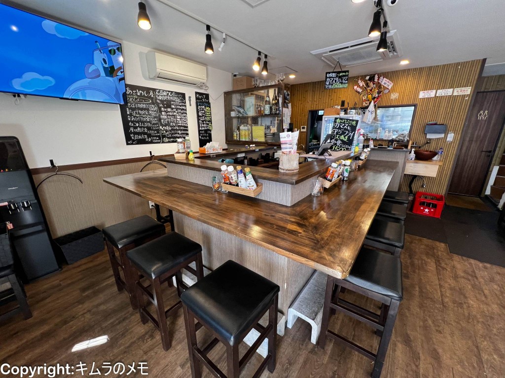 店内は刺身や冷凍の海鮮などが販売されるエリアが併設されており、カウンター席のみ10席程度とこぢんまりとした造りになっている。