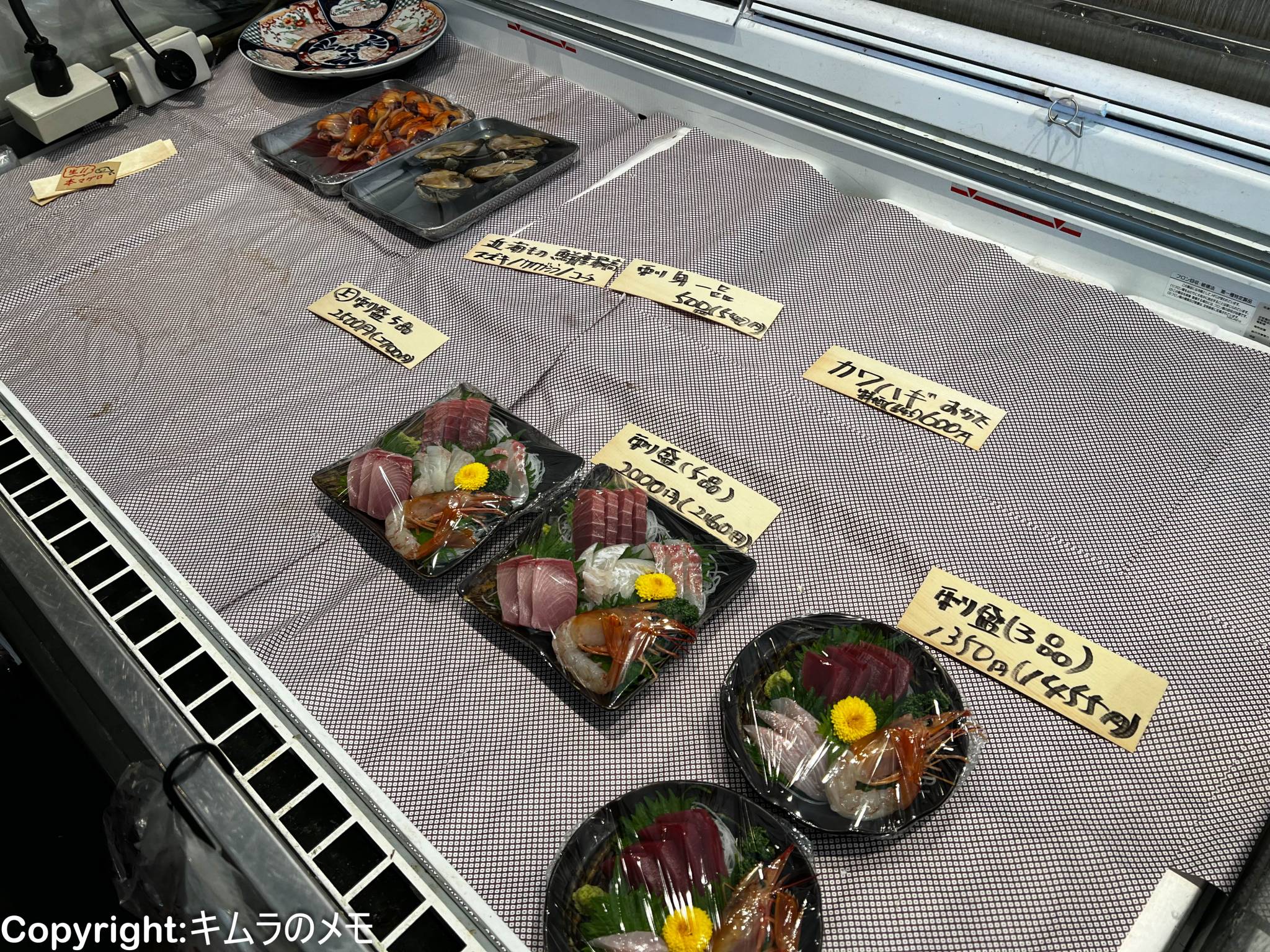 その後ろには刺身や冷凍の魚介を販売するエリアがあるが、11時頃ということなのか、作り置きは極力避けるということなのか、陳列されている刺身の種類はそこまで多くない。