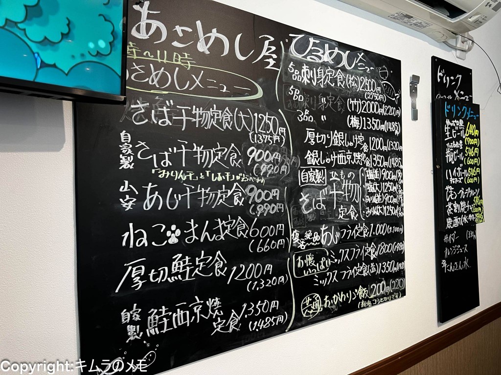 11時までは1000円で楽しめる焼魚系の定食があるが、11時以降はランチメニューに変わり、サバ干物定食やアジフライやフライ系の定食、刺身系の定食などがメインとなっている。