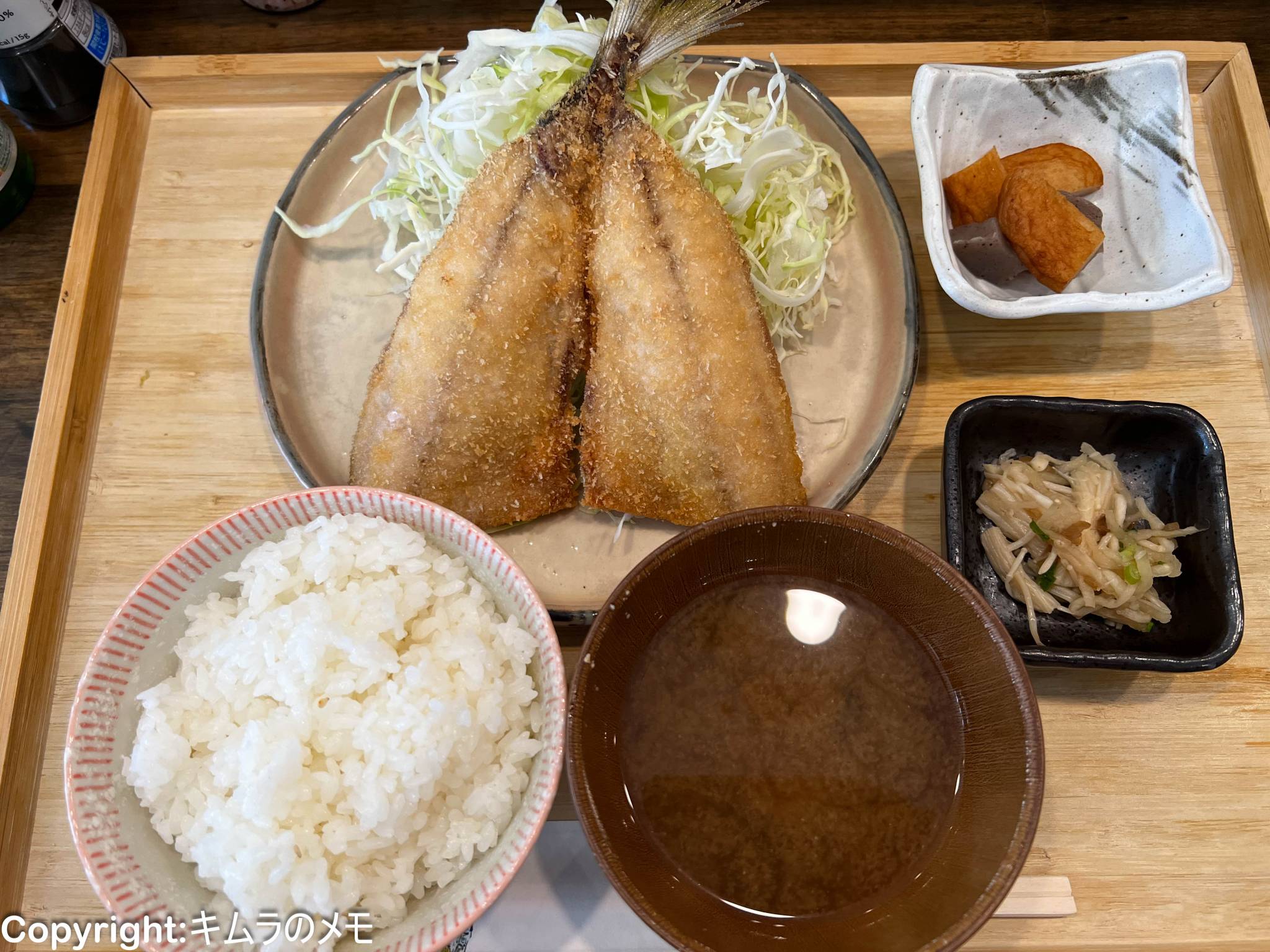 定食ということで、メインのアジフライに加えて付け合わせの小鉢が2つ、そしてご飯と味噌汁がワンプレートで提供される。