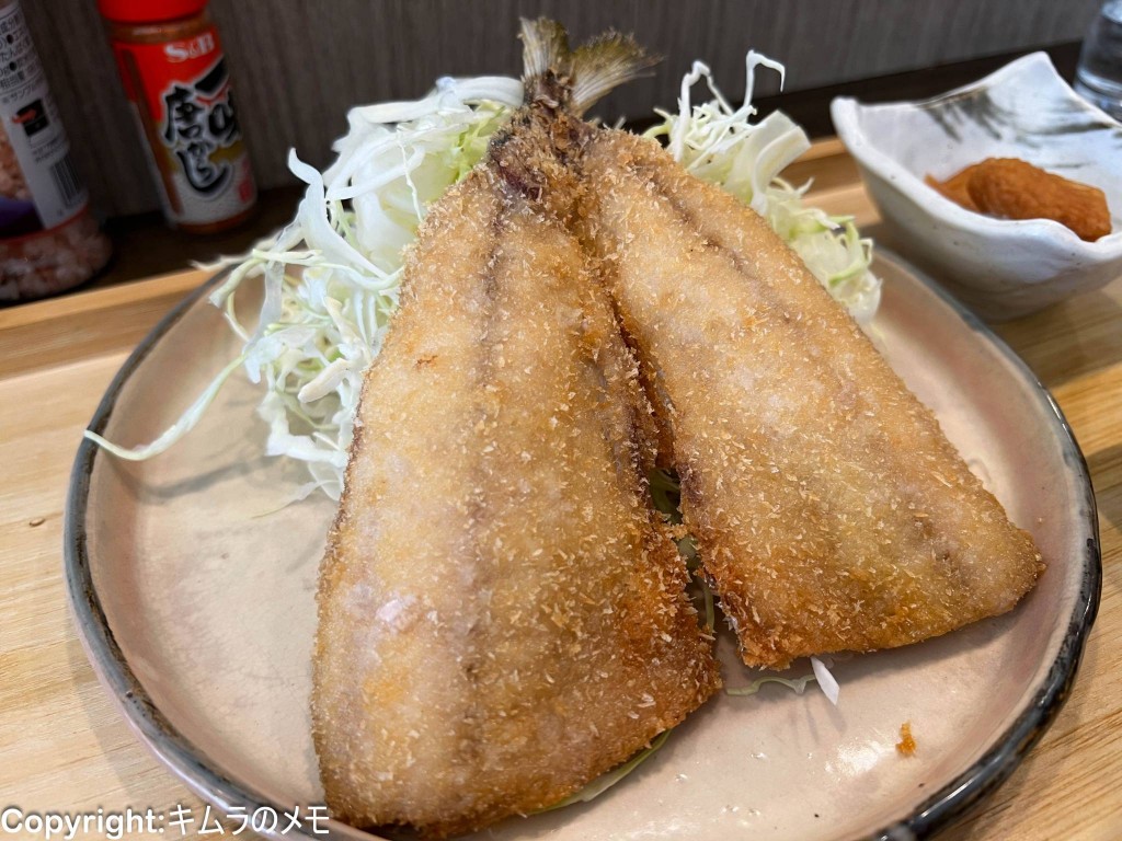 一般的な定食のアジフライと比較すると20センチ程度と確かに大ぶりのサイズ感ではあるのだが、通常のアジフライ定食が1000円であることを考えると、このサイズ感でプラス500円というのは微妙かも知れない。