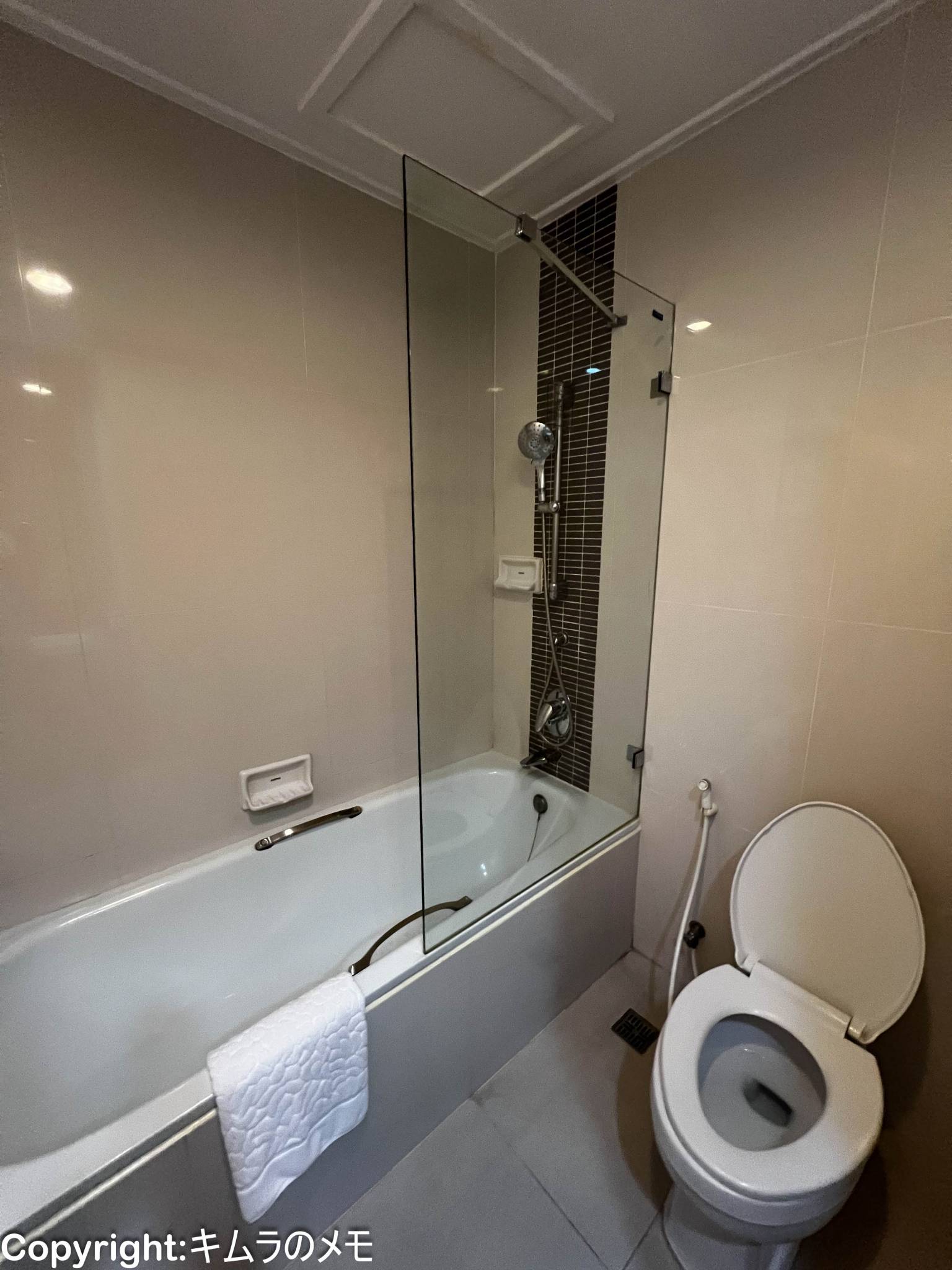 左側にはバスタブとシャワーが設置されているが、シャワーカーテンが無い代わりにガラスのパーティションが設置されている。