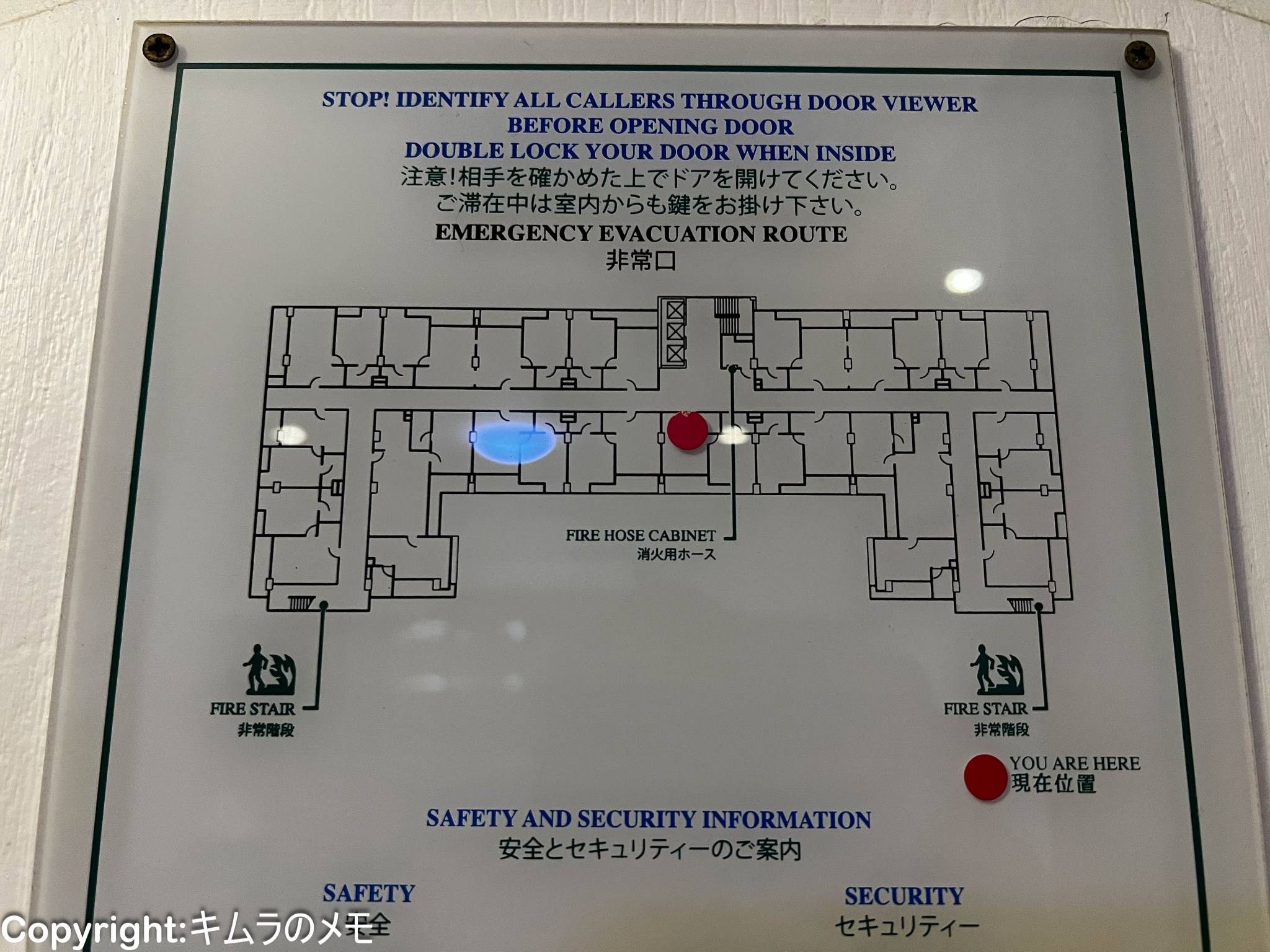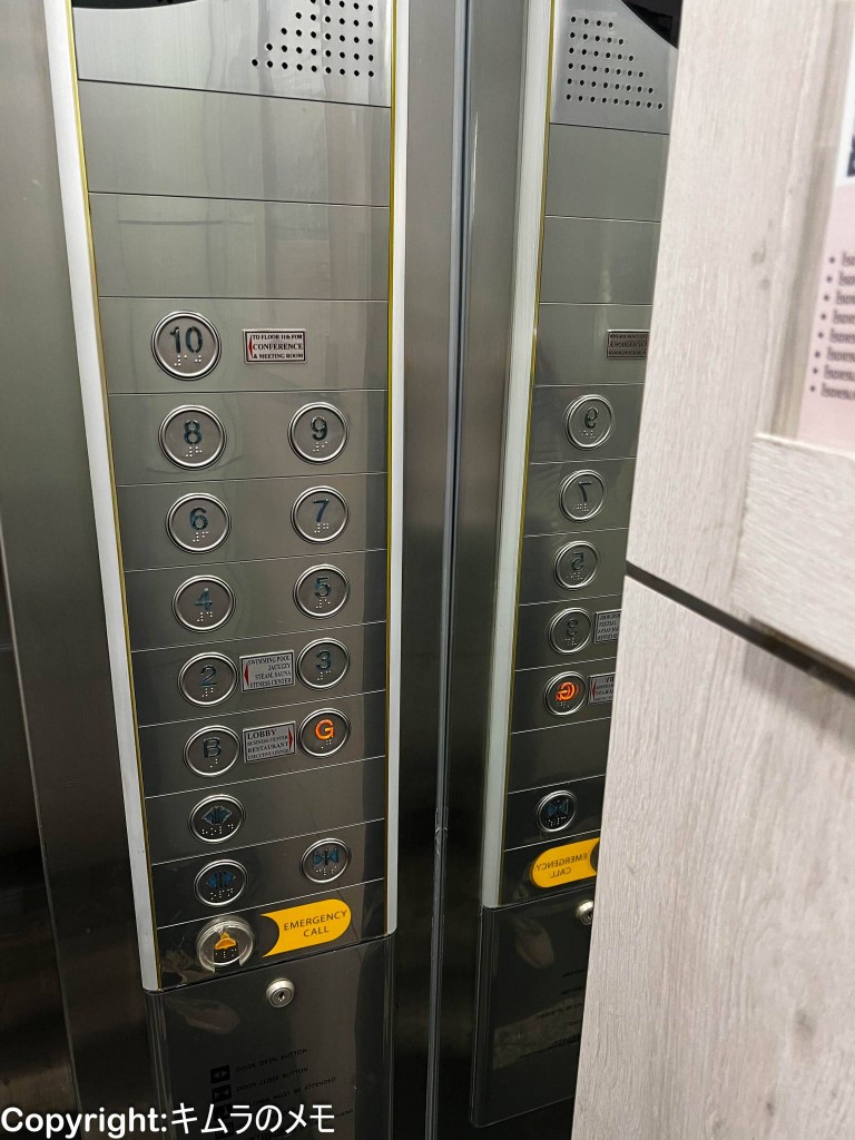 エレベーターは建物中央にあり、今回はほぼエレベーター前の部屋をアサインされたのでエレベーターまでのアクセスは全く気にならなかったが、一番端の部屋だと通路を曲がってのアクセスとなるので少々遠いかも知れない。