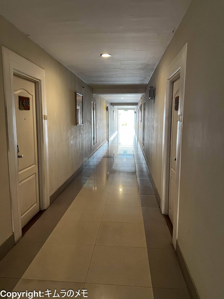 エレベーターホールから客室に向かうが、白を基調とした造りとなっており床はタイル張りと、カンタリーヒルズチェンマイと似たような雰囲気。