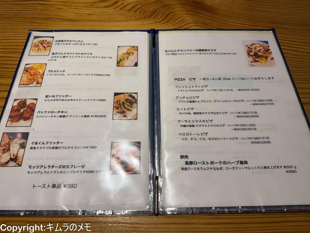 今回は前菜メニューから「島ダコとドライトマトのマリネ(1100円)」、「紅いもフリッター(680円)」をセレクト、ピザはハーフサイズで「アーサとしらすのピザ(1200円)」、そしてパスタから「リガトーニのもつ煮込みパスタ(1280円)」と「イカ墨パスタ(1680円)」をオーダーした。