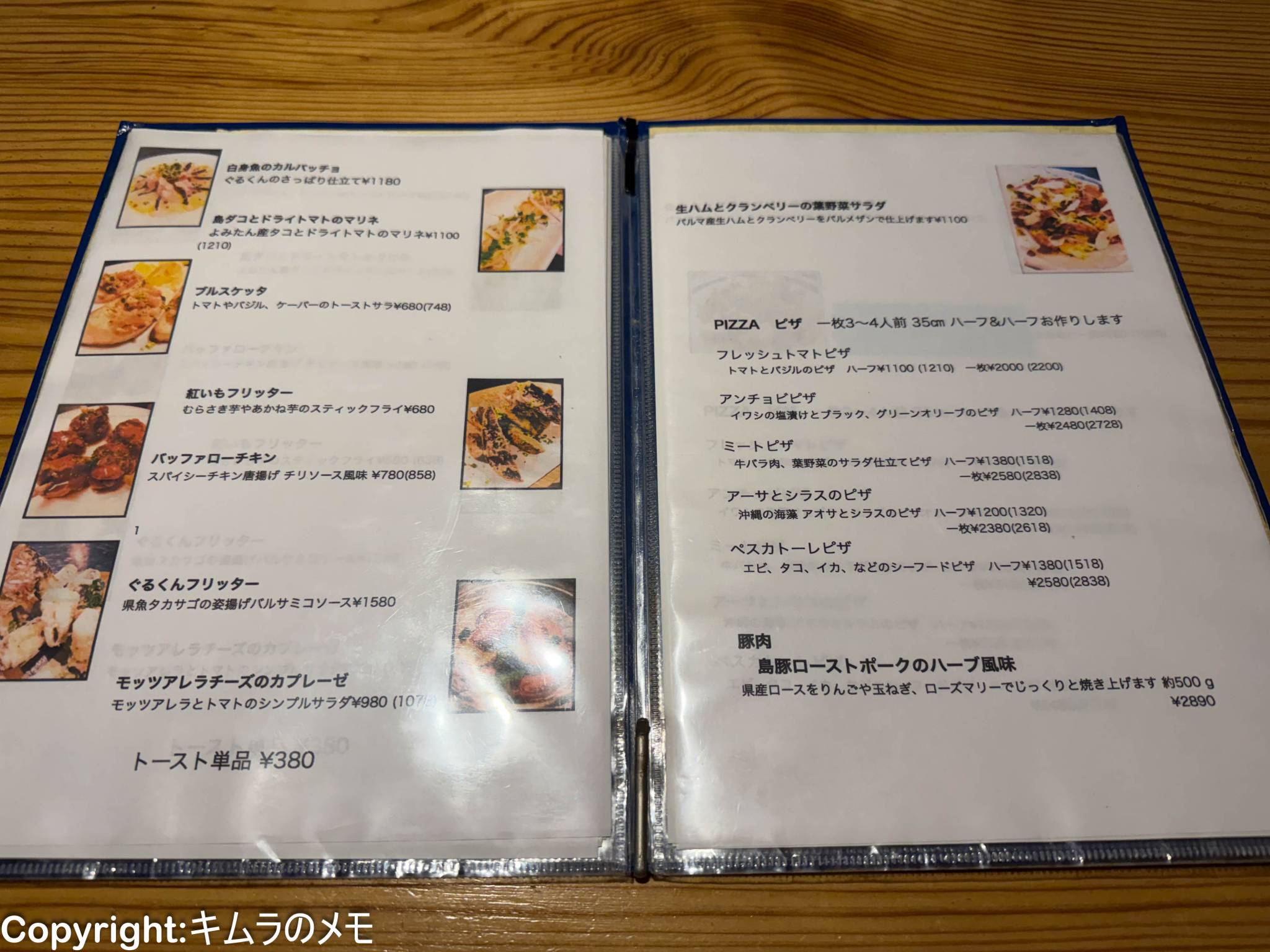 料理のメニューは比較的絞られており、こちらのページで前菜系とピザ、肉料理がカバーされている。