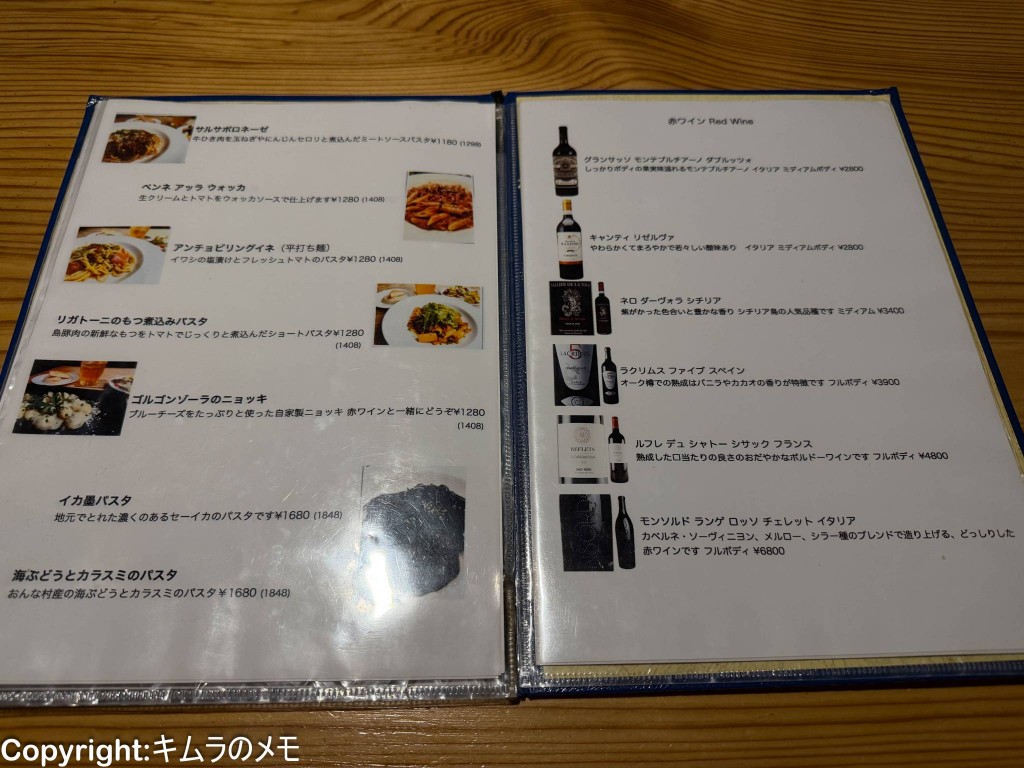 パスタは7種類用意されており、ボトルの赤ワインは6種類用意されている。