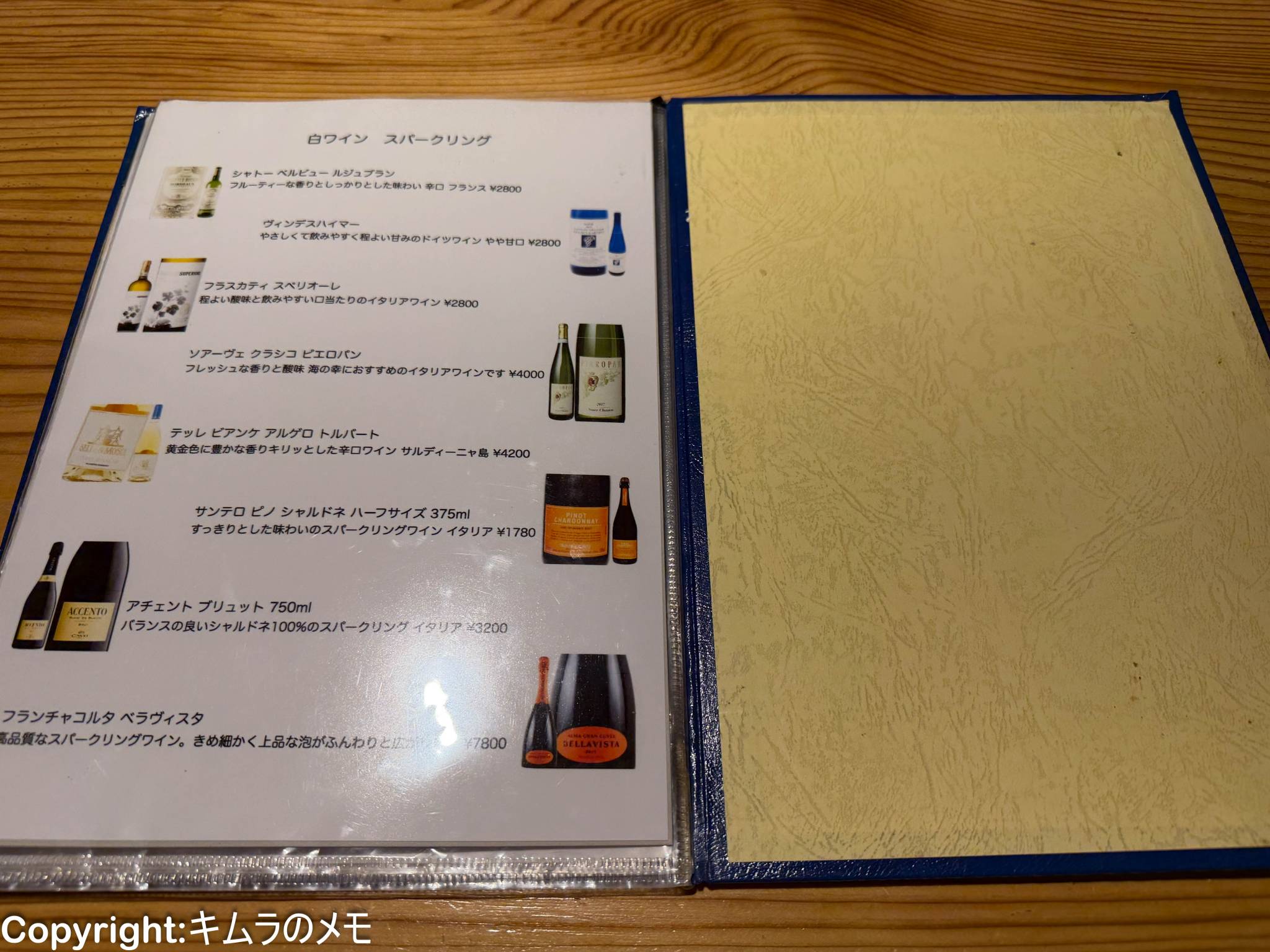 こちらがボトルワイン以外のドリンクメニュー。