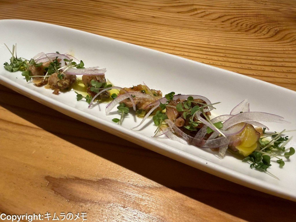 一口弱にカットされた島ダコがマリネのソースを吸ってセミドライになったトマトと共にキレイに盛られての提供。