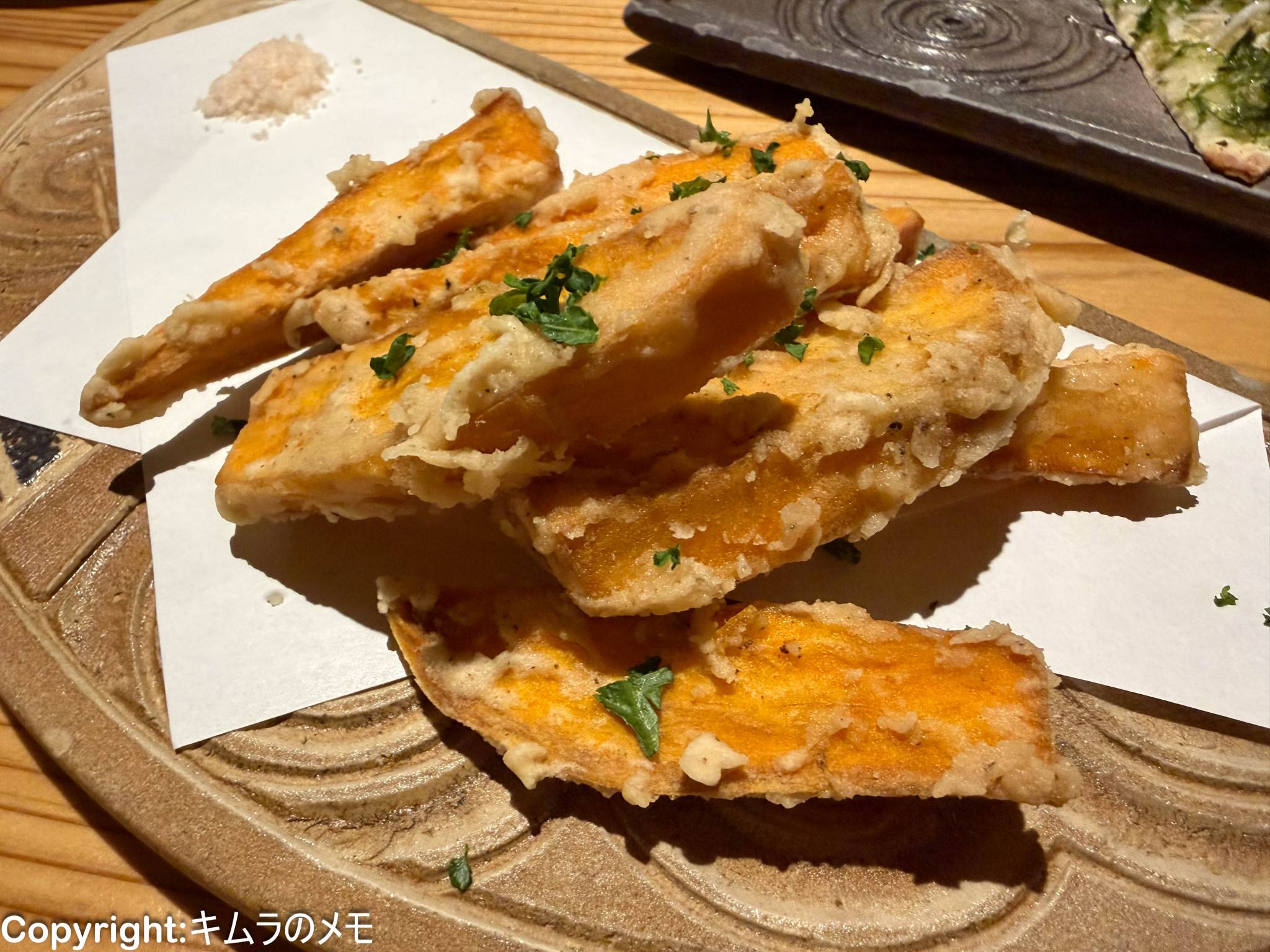 料理自体は非常にシンプルで紅芋をフリットしたものなのだが、その紅芋の甘味がとても強く濃厚で、しっかりと揚げられていることもありカリカリっとした食感もとても美味しい。