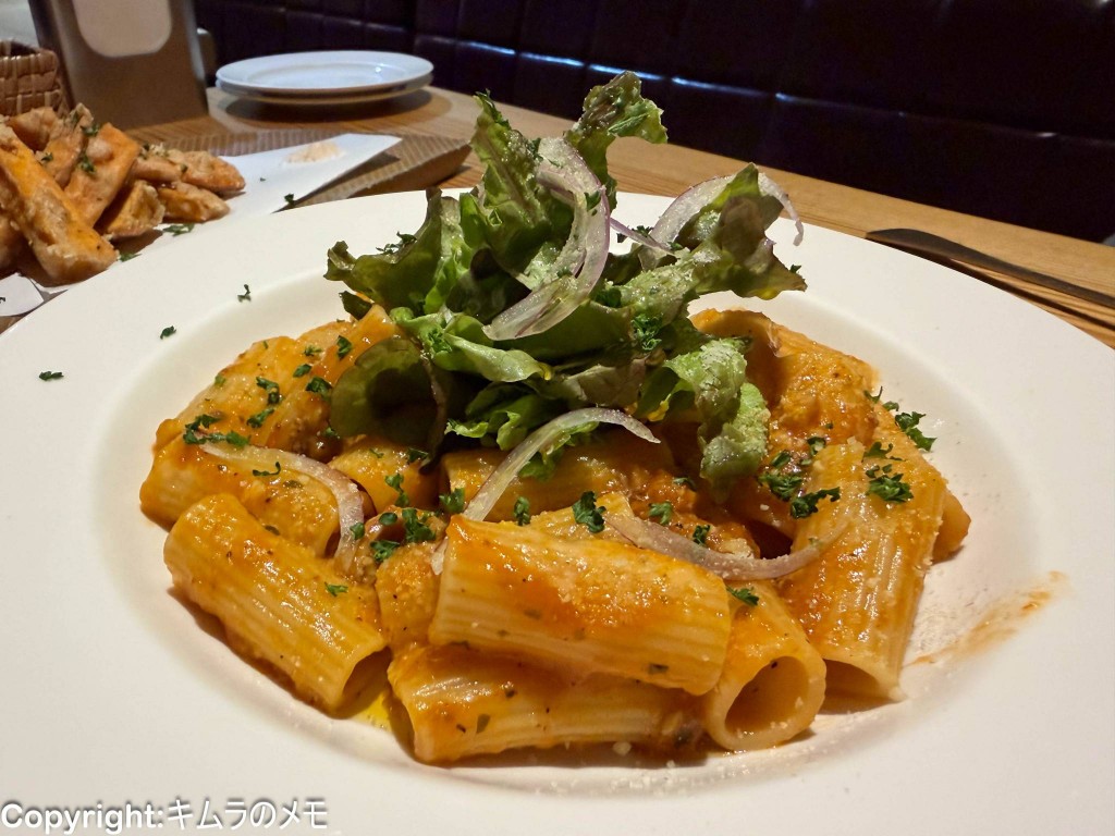 この日は朝にランニングをしたこともあり、まだまだ食べられたので追加で「リガトーニのもつ煮込みパスタ」をオーダー。